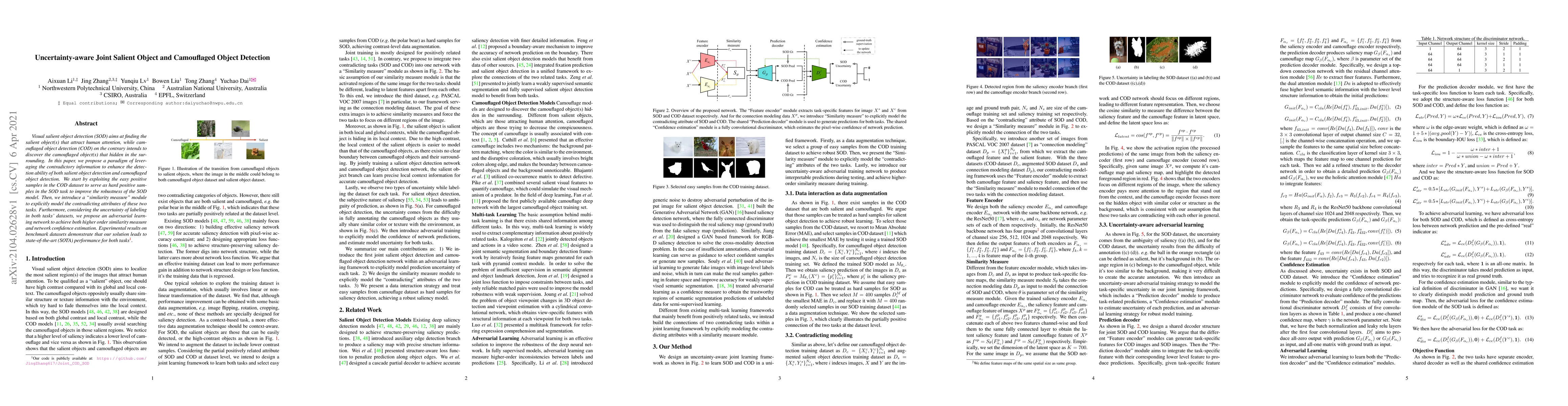 Visual salient object detection (SOD) aims at finding the salient object(s) that attract human attention, while camouflaged object detection (COD) on the contrary intends to discover the camouflaged object(s) that hidden in the surrounding. In this paper, we propose a paradigm of leveraging the contradictory information to enhance the detection ability of both salient object detection and camouflaged object detection. We start by exploiting the easy positive samples in the COD dataset to serve as hard positive samples in the SOD task to improve the robustness of the SOD model. Then, we introduce a similarity measure module to explicitly model the contradicting attributes of these two tasks. Furthermore, considering the uncertainty of labeling in both tasks' datasets, we propose an adversarial learning network to achieve both higher order similarity measure and network confidence estimation. Experimental results on benchmark datasets demonstrate that our solution leads to state-of-the-art (SOTA) performance for both tasks.