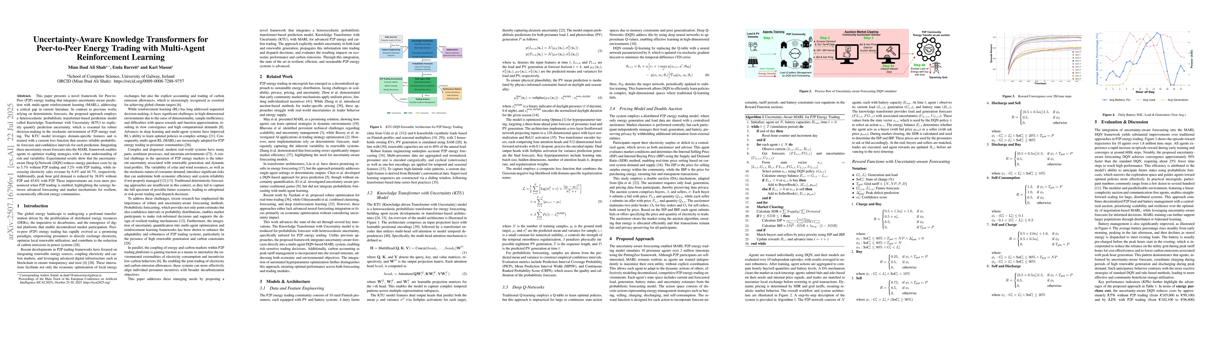 The introduction of the Knowledge Transformer with Uncertainty (KTU) model for probabilistic forecasting with heteroscedastic uncertainty, specifically tailored for P2P energy trading, and its integration into a multi-agent DQN-based MARL system for risk-sensitive, anticipatory decision-making.