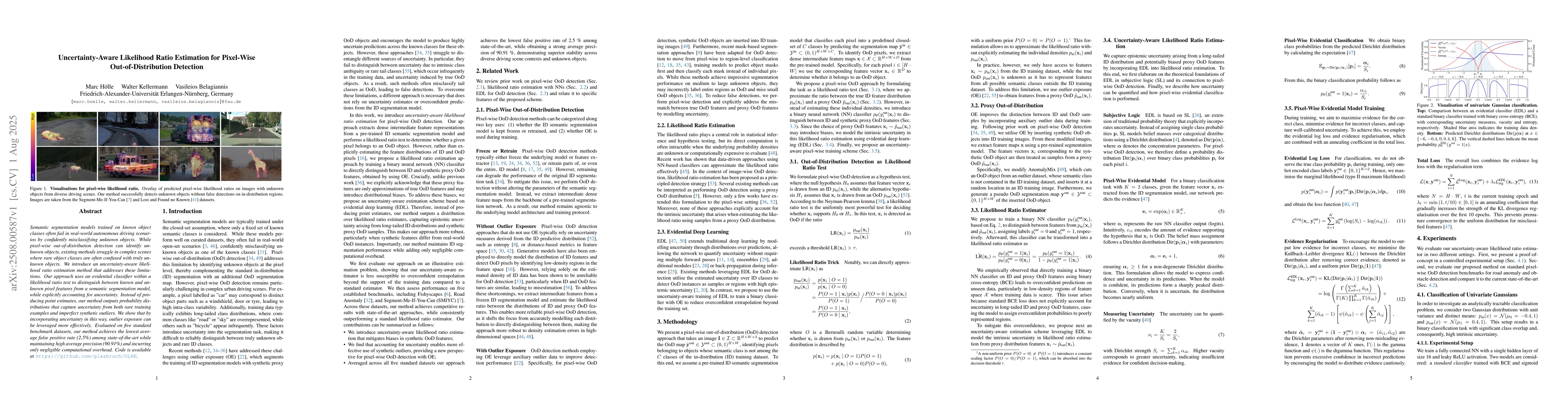 Semantic segmentation models trained on known object classes often fail in real-world autonomous driving scenarios by confidently misclassifying unknown objects. While pixel-wise out-of-distribution detection can identify unknown objects, existing methods struggle in complex scenes where rare object classes are often confused with truly unknown objects. We introduce an uncertainty-aware likelihood ratio estimation method that addresses these limitations. Our approach uses an evidential classifier within a likelihood ratio test to distinguish between known and unknown pixel features from a semantic segmentation model, while explicitly accounting for uncertainty. Instead of producing point estimates, our method outputs probability distributions that capture uncertainty from both rare training examples and imperfect synthetic outliers. We show that by incorporating uncertainty in this way, outlier exposure can be leveraged more effectively. Evaluated on five standard benchmark datasets, our method achieves the lowest average false positive rate (2.5%) among state-of-the-art while maintaining high average precision (90.91%) and incurring only negligible computational overhead. Code is available at https://github.com/glasbruch/ULRE.