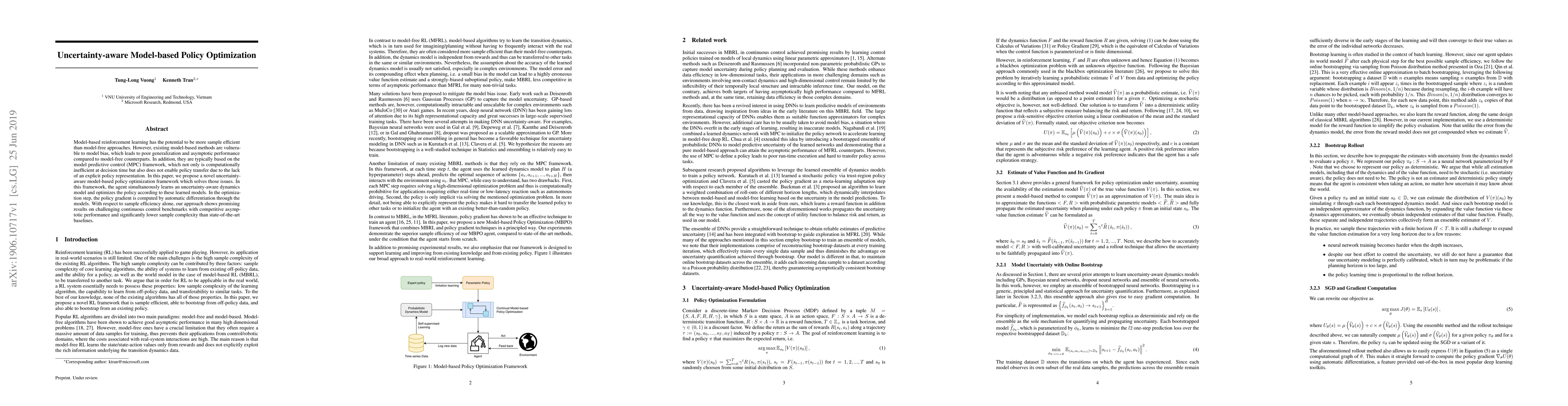 This paper introduces an uncertainty-aware model-based policy optimization framework that addresses model bias and computational inefficiencies in model-based reinforcement learning. It achieves better sample efficiency and competitive performance on continuous control tasks compared to existing methods.
