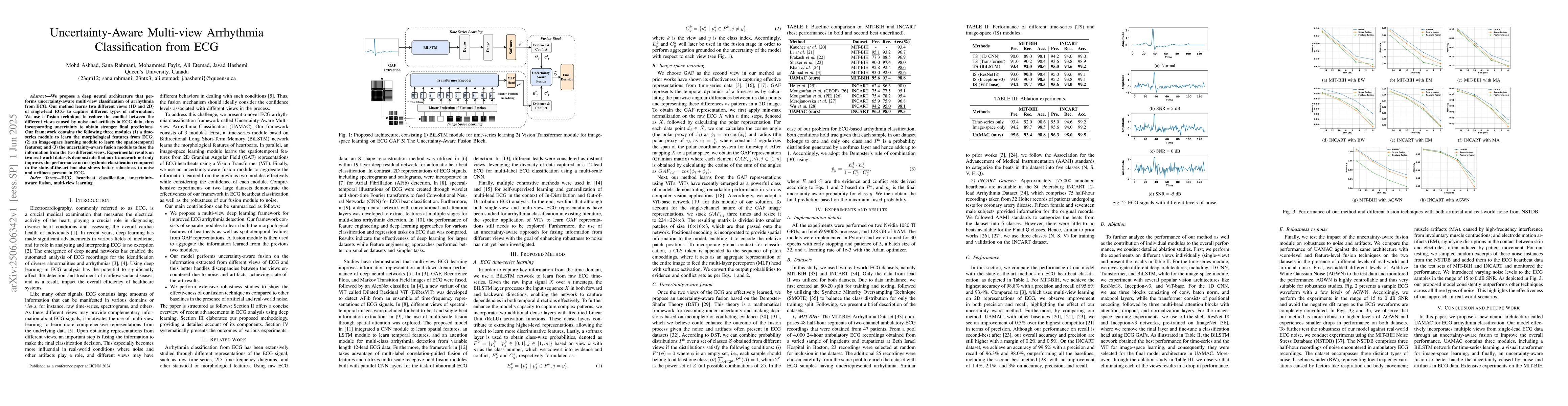We propose a deep neural architecture that performs uncertainty-aware multi-view classification of arrhythmia from ECG. Our method learns two different views (1D and 2D) of single-lead ECG to capture different types of information. We use a fusion technique to reduce the conflict between the different views caused by noise and artifacts in ECG data, thus incorporating uncertainty to obtain stronger final predictions. Our framework contains the following three modules (1) a time-series module to learn the morphological features from ECG; (2) an image-space learning module to learn the spatiotemporal features; and (3) the uncertainty-aware fusion module to fuse the information from the two different views. Experimental results on two real-world datasets demonstrate that our framework not only improves the performance on arrhythmia classification compared to the state-of-the-art but also shows better robustness to noise and artifacts present in ECG.