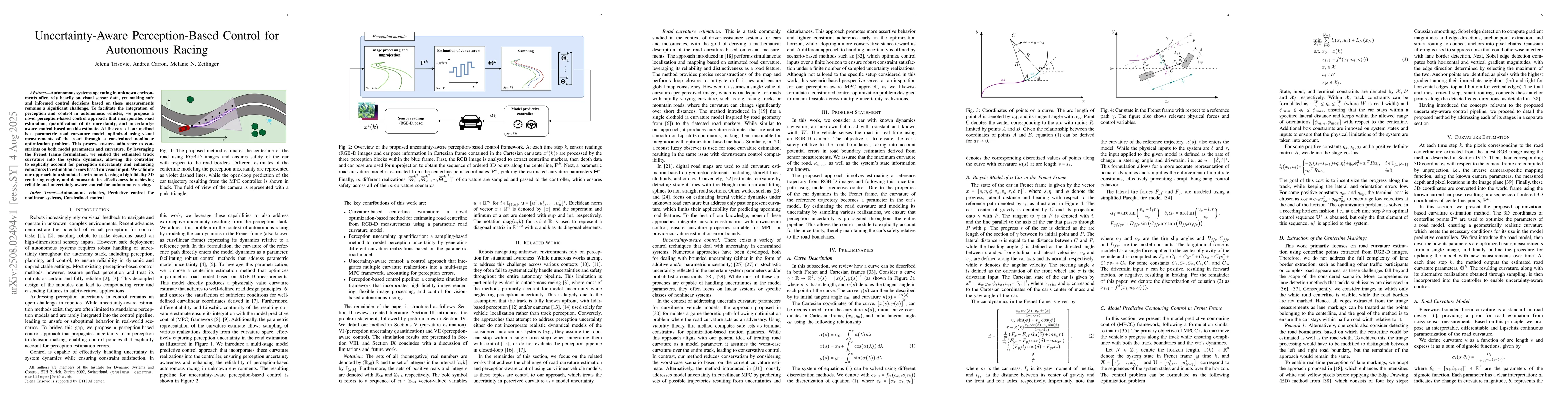 Autonomous systems operating in unknown environments often rely heavily on visual sensor data, yet making safe and informed control decisions based on these measurements remains a significant challenge. To facilitate the integration of perception and control in autonomous vehicles, we propose a novel perception-based control approach that incorporates road estimation, quantification of its uncertainty, and uncertainty-aware control based on this estimate. At the core of our method is a parametric road curvature model, optimized using visual measurements of the road through a constrained nonlinear optimization problem. This process ensures adherence to constraints on both model parameters and curvature. By leveraging the Frenet frame formulation, we embed the estimated track curvature into the system dynamics, allowing the controller to explicitly account for perception uncertainty and enhancing robustness to estimation errors based on visual input. We validate our approach in a simulated environment, using a high-fidelity 3D rendering engine, and demonstrate its effectiveness in achieving reliable and uncertainty-aware control for autonomous racing.