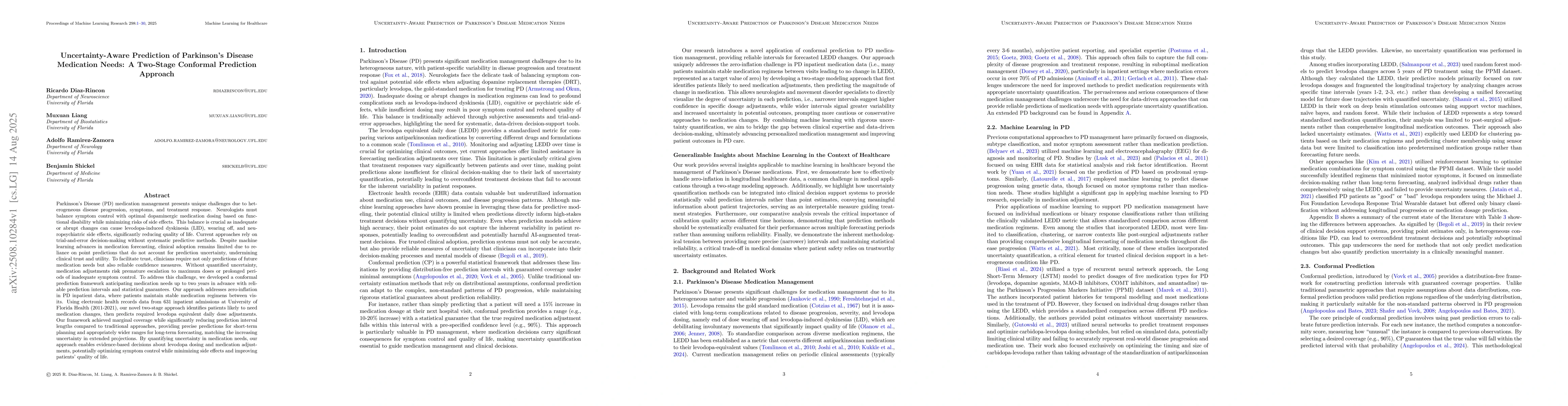 Parkinson's Disease (PD) medication management presents unique challenges due to heterogeneous disease progression and treatment response. Neurologists must balance symptom control with optimal dopaminergic dosing based on functional disability while minimizing side effects. This balance is crucial as inadequate or abrupt changes can cause levodopa-induced dyskinesia, wearing off, and neuropsychiatric effects, significantly reducing quality of life. Current approaches rely on trial-and-error decisions without systematic predictive methods. Despite machine learning advances, clinical adoption remains limited due to reliance on point predictions that do not account for prediction uncertainty, undermining clinical trust and utility. Clinicians require not only predictions of future medication needs but also reliable confidence measures. Without quantified uncertainty, adjustments risk premature escalation to maximum doses or prolonged inadequate symptom control. We developed a conformal prediction framework anticipating medication needs up to two years in advance with reliable prediction intervals and statistical guarantees. Our approach addresses zero-inflation in PD inpatient data, where patients maintain stable medication regimens between visits. Using electronic health records from 631 inpatient admissions at University of Florida Health (2011-2021), our two-stage approach identifies patients likely to need medication changes, then predicts required levodopa equivalent daily dose adjustments. Our framework achieved marginal coverage while reducing prediction interval lengths compared to traditional approaches, providing precise predictions for short-term planning and wider ranges for long-term forecasting. By quantifying uncertainty, our approach enables evidence-based decisions about levodopa dosing, optimizing symptom control while minimizing side effects and improving life quality.