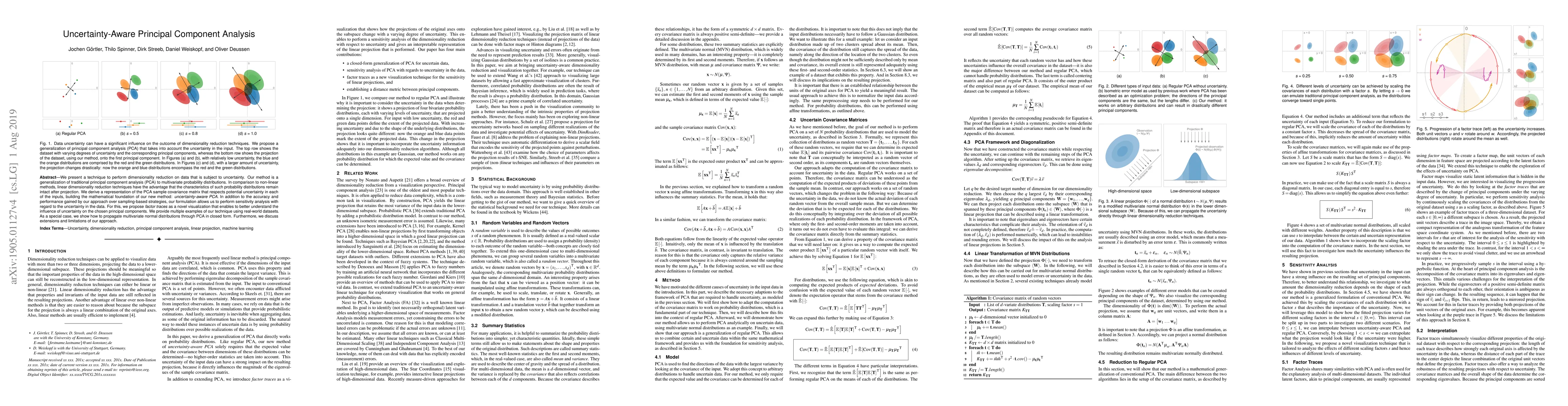 This paper introduces uncertainty-aware PCA, a method for dimensionality reduction that generalizes traditional PCA to handle data with uncertainty. It provides a mathematical foundation for representing uncertainty in the PCA sample covariance matrix and enables sensitivity analysis, offering improved accuracy and performance over sampling-based methods.