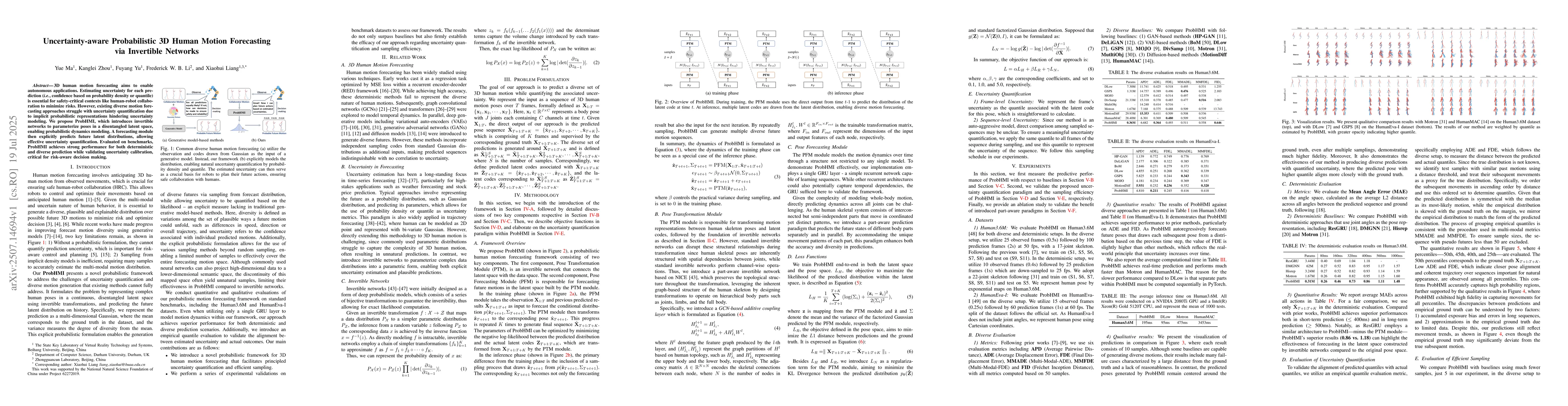 3D human motion forecasting aims to enable autonomous applications. Estimating uncertainty for each prediction (i.e., confidence based on probability density or quantile) is essential for safety-critical contexts like human-robot collaboration to minimize risks. However, existing diverse motion forecasting approaches struggle with uncertainty quantification due to implicit probabilistic representations hindering uncertainty modeling. We propose ProbHMI, which introduces invertible networks to parameterize poses in a disentangled latent space, enabling probabilistic dynamics modeling. A forecasting module then explicitly predicts future latent distributions, allowing effective uncertainty quantification. Evaluated on benchmarks, ProbHMI achieves strong performance for both deterministic and diverse prediction while validating uncertainty calibration, critical for risk-aware decision making.