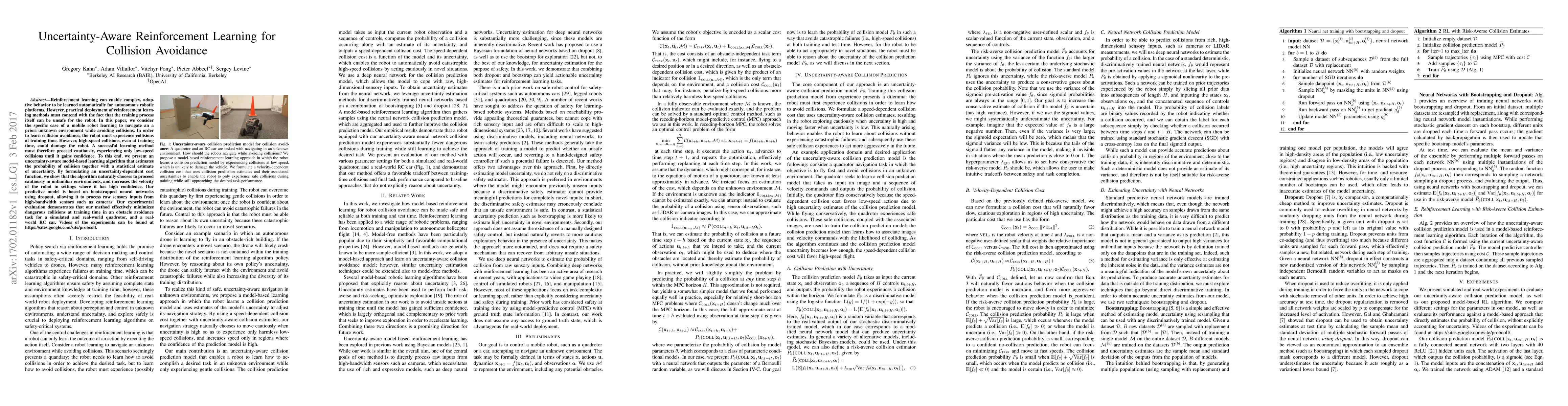Reinforcement learning can enable complex, adaptive behavior to be learned automatically for autonomous robotic platforms. However, practical deployment of reinforcement learning methods must contend with the fact that the training process itself can be unsafe for the robot. In this paper, we consider the specific case of a mobile robot learning to navigate an a priori unknown environment while avoiding collisions. In order to learn collision avoidance, the robot must experience collisions at training time. However, high-speed collisions, even at training time, could damage the robot. A successful learning method must therefore proceed cautiously, experiencing only low-speed collisions until it gains confidence. To this end, we present an uncertainty-aware model-based learning algorithm that estimates the probability of collision together with a statistical estimate of uncertainty. By formulating an uncertainty-dependent cost function, we show that the algorithm naturally chooses to proceed cautiously in unfamiliar environments, and increases the velocity of the robot in settings where it has high confidence. Our predictive model is based on bootstrapped neural networks using dropout, allowing it to process raw sensory inputs from high-bandwidth sensors such as cameras. Our experimental evaluation demonstrates that our method effectively minimizes dangerous collisions at training time in an obstacle avoidance task for a simulated and real-world quadrotor, and a real-world RC car. Videos of the experiments can be found at https://sites.google.com/site/probcoll.