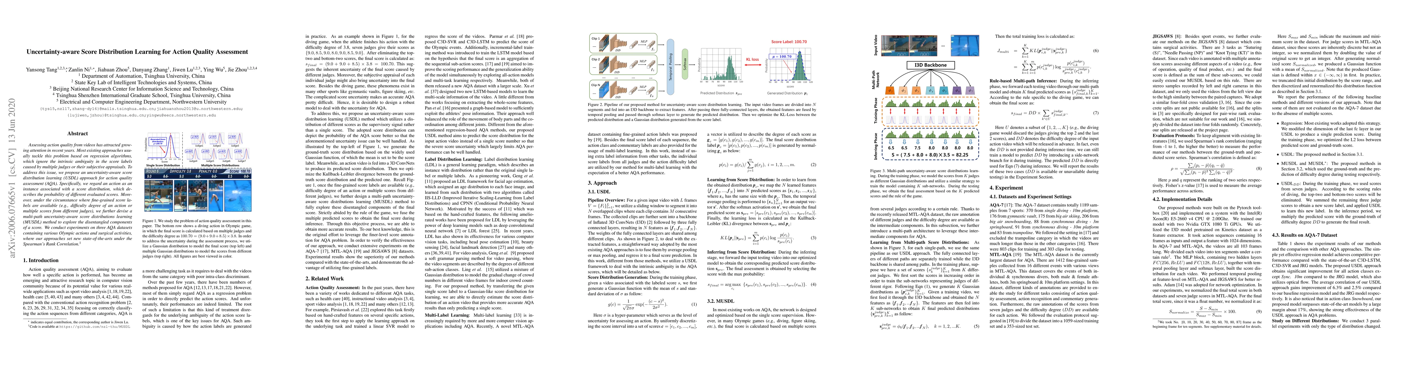 This paper proposes an uncertainty-aware score distribution learning (USDL) approach to assess action quality from videos, addressing the ambiguity in score labels from multiple judges. It introduces a multi-path uncertainty-aware score distributions learning (MUSDL) method to explore disentangled components of a score, achieving state-of-the-art results on three datasets.