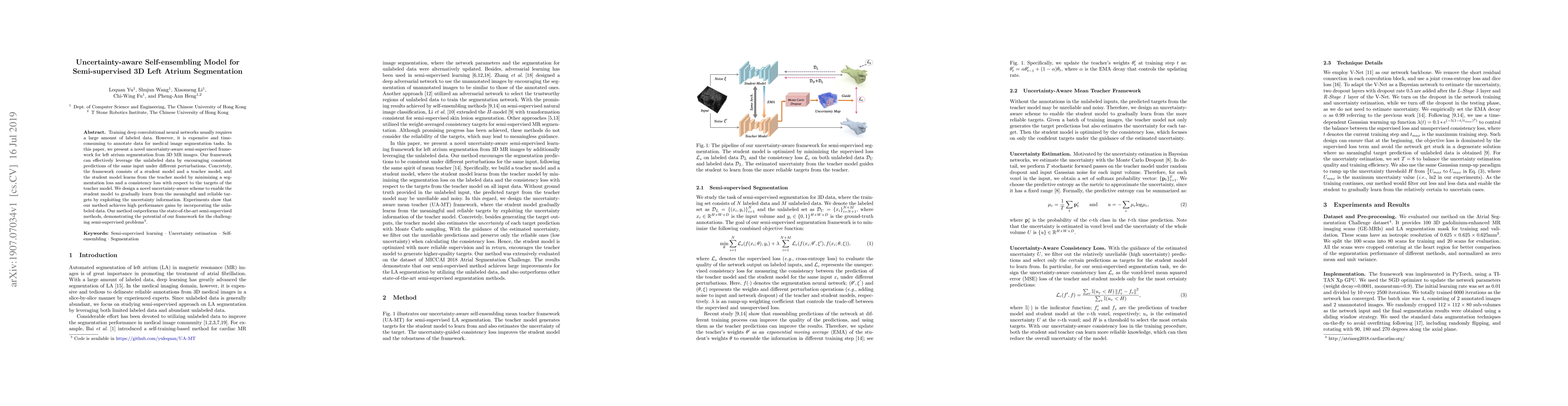 This paper proposes an uncertainty-aware semi-supervised model to segment the left atrium in 3D MR images, leveraging unlabeled data to improve performance. The framework uses a student-teacher model setup and an uncertainty-based method to enhance learning from unlabeled data, outperforming existing semi-supervised methods.