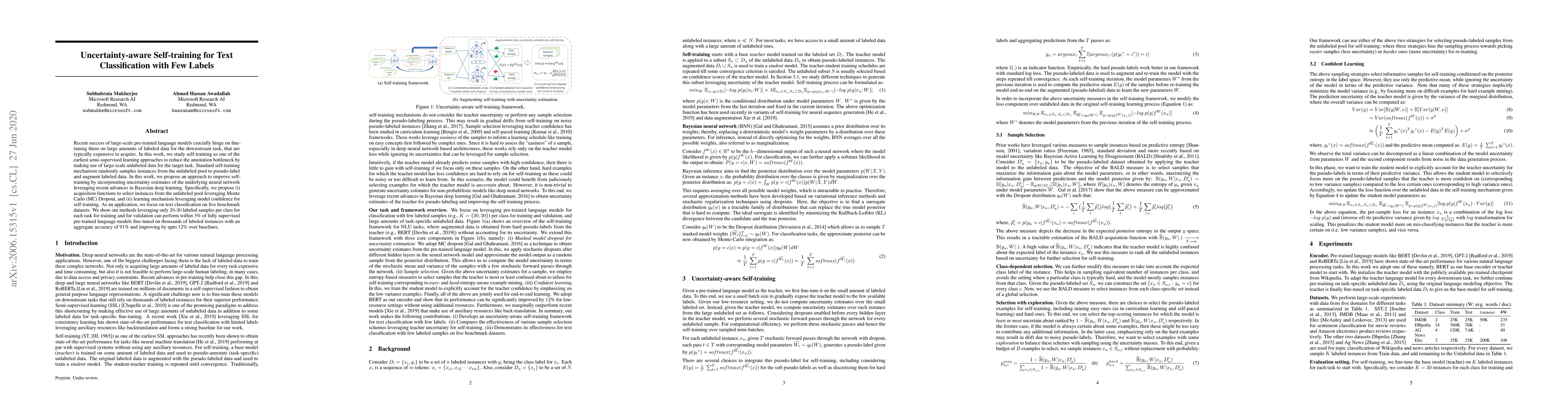 This paper proposes an uncertainty-aware self-training approach for text classification with few labels, achieving accuracy comparable to fully supervised pre-trained language models on 91% aggregate.