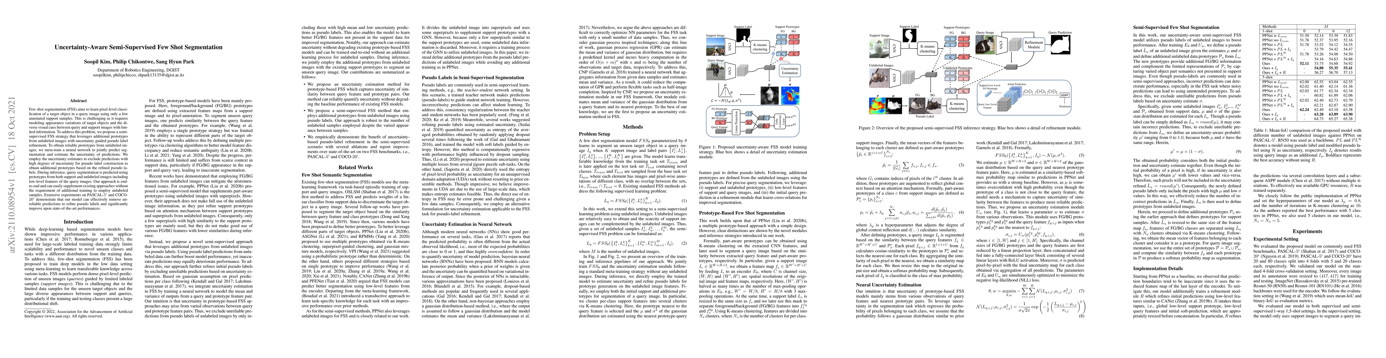 This research introduces an uncertainty-aware semi-supervised few-shot segmentation method, enhancing pixel-level classification of target objects in query images using few annotated samples. It achieves this by employing prototypes from unlabeled images with uncertainty-guided pseudo label refinement, significantly improving upon existing state-of-the-art performances on PASCAL-5i and COCO-20i datasets.