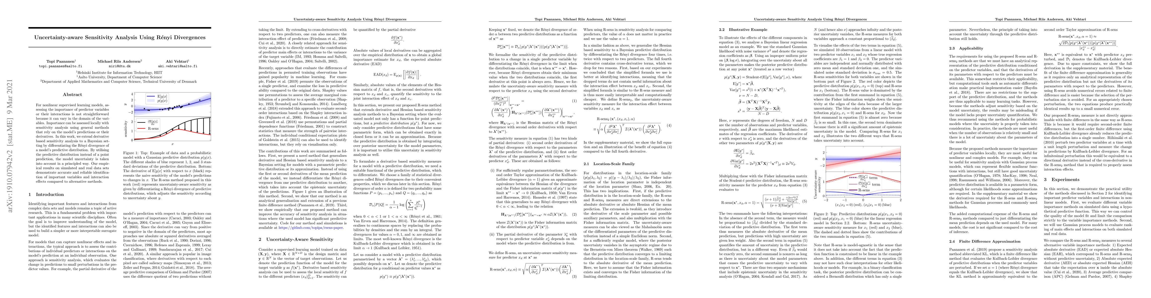 This paper proposes an uncertainty-aware sensitivity analysis method using Rényi divergences for nonlinear supervised learning models. It differentiates the Rényi divergence of a model's predictive distribution to account for uncertainty, enabling accurate identification of important variables and interaction effects.