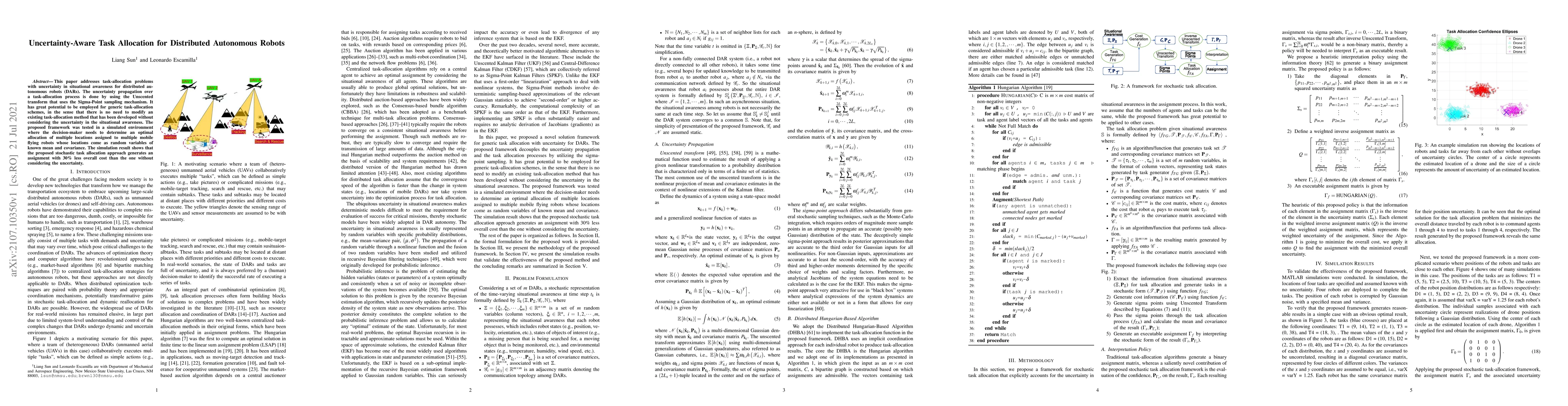 This paper addresses task-allocation problems with uncertainty in situational awareness for distributed autonomous robots (DARs). The uncertainty propagation over a task-allocation process is done by using the Unscented transform that uses the Sigma-Point sampling mechanism. It has great potential to be employed for generic task-allocation schemes, in the sense that there is no need to modify an existing task-allocation method that has been developed without considering the uncertainty in the situational awareness. The proposed framework was tested in a simulated environment where the decision-maker needs to determine an optimal allocation of multiple locations assigned to multiple mobile flying robots whose locations come as random variables of known mean and covariance. The simulation result shows that the proposed stochastic task allocation approach generates an assignment with 30% less overall cost than the one without considering the uncertainty.