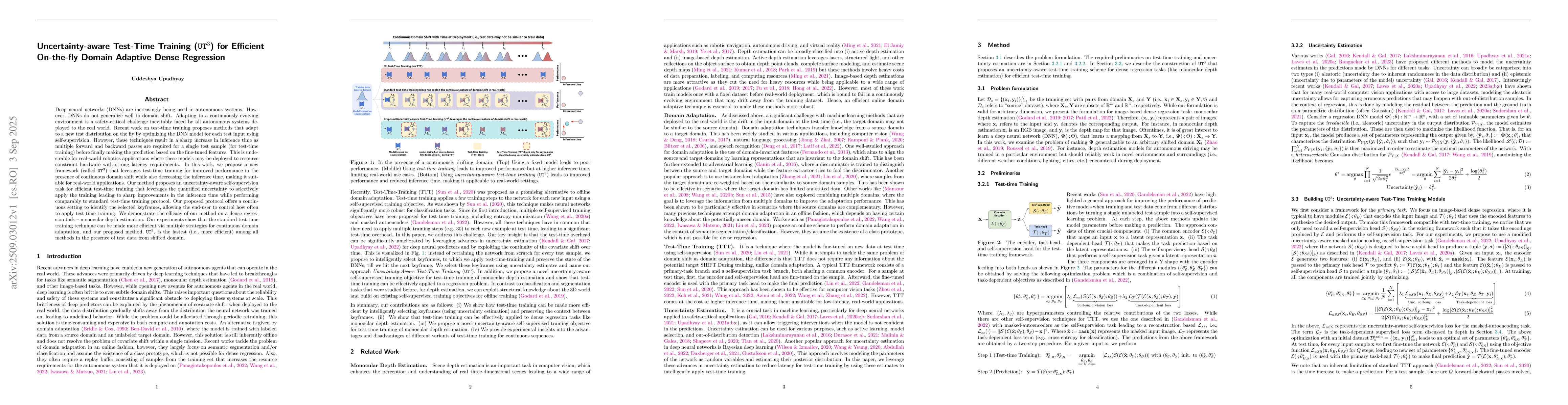 Deep neural networks (DNNs) are increasingly being used in autonomous systems. However, DNNs do not generalize well to domain shift. Adapting to a continuously evolving environment is a safety-critical challenge inevitably faced by all autonomous systems deployed to the real world. Recent work on test-time training proposes methods that adapt to a new test distribution on the fly by optimizing the DNN model for each test input using self-supervision. However, these techniques result in a sharp increase in inference time as multiple forward and backward passes are required for a single test sample (for test-time training) before finally making the prediction based on the fine-tuned features. This is undesirable for real-world robotics applications where these models may be deployed to resource constraint hardware with strong latency requirements. In this work, we propose a new framework (called UT$^3$) that leverages test-time training for improved performance in the presence of continuous domain shift while also decreasing the inference time, making it suitable for real-world applications. Our method proposes an uncertainty-aware self-supervision task for efficient test-time training that leverages the quantified uncertainty to selectively apply the training leading to sharp improvements in the inference time while performing comparably to standard test-time training protocol. Our proposed protocol offers a continuous setting to identify the selected keyframes, allowing the end-user to control how often to apply test-time training. We demonstrate the efficacy of our method on a dense regression task - monocular depth estimation.