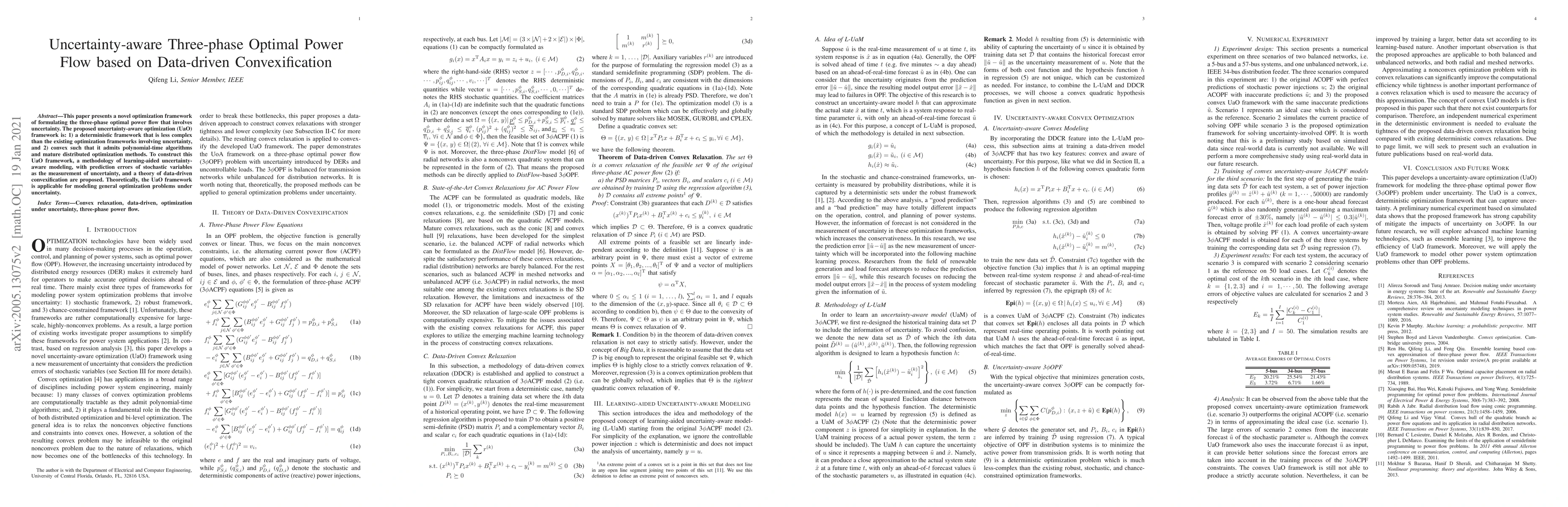 This paper introduces a novel, less complex, and convex uncertainty-aware optimization framework for three-phase optimal power flow, leveraging data-driven convexification and learning-aided modeling to handle uncertainty efficiently. The proposed framework is theoretically applicable to general optimization problems under uncertainty.
