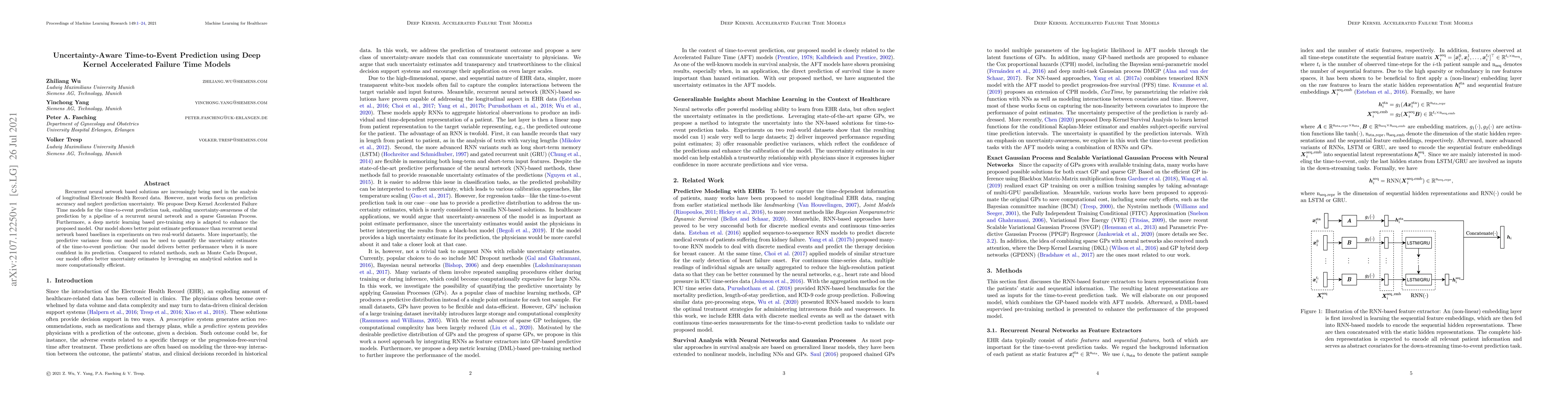 Recurrent neural network based solutions are increasingly being used in the analysis of longitudinal Electronic Health Record data. However, most works focus on prediction accuracy and neglect prediction uncertainty. We propose Deep Kernel Accelerated Failure Time models for the time-to-event prediction task, enabling uncertainty-awareness of the prediction by a pipeline of a recurrent neural network and a sparse Gaussian Process. Furthermore, a deep metric learning based pre-training step is adapted to enhance the proposed model. Our model shows better point estimate performance than recurrent neural network based baselines in experiments on two real-world datasets. More importantly, the predictive variance from our model can be used to quantify the uncertainty estimates of the time-to-event prediction: Our model delivers better performance when it is more confident in its prediction. Compared to related methods, such as Monte Carlo Dropout, our model offers better uncertainty estimates by leveraging an analytical solution and is more computationally efficient.