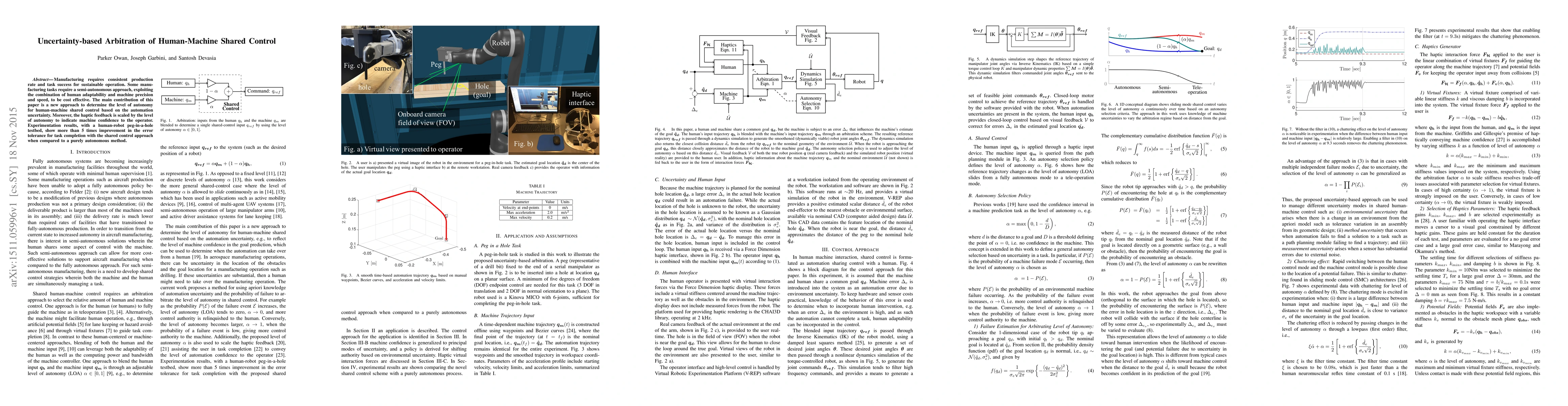 Manufacturing requires consistent production rate and task success for sustainable operation. Some manufacturing tasks require a semi-autonomous approach, exploiting the combination of human adaptability and machine precision and speed, to be cost effective. The main contribution of this paper is a new approach to determine the level of autonomy for human-machine shared control based on the automation uncertainty. Moreover, the haptic feedback is scaled by the level of autonomy to indicate machine confidence to the operator. Experimentation results, with a human-robot peg-in-a-hole testbed, show more than 5 times improvement in the error tolerance for task completion with the shared control approach when compared to a purely autonomous method.