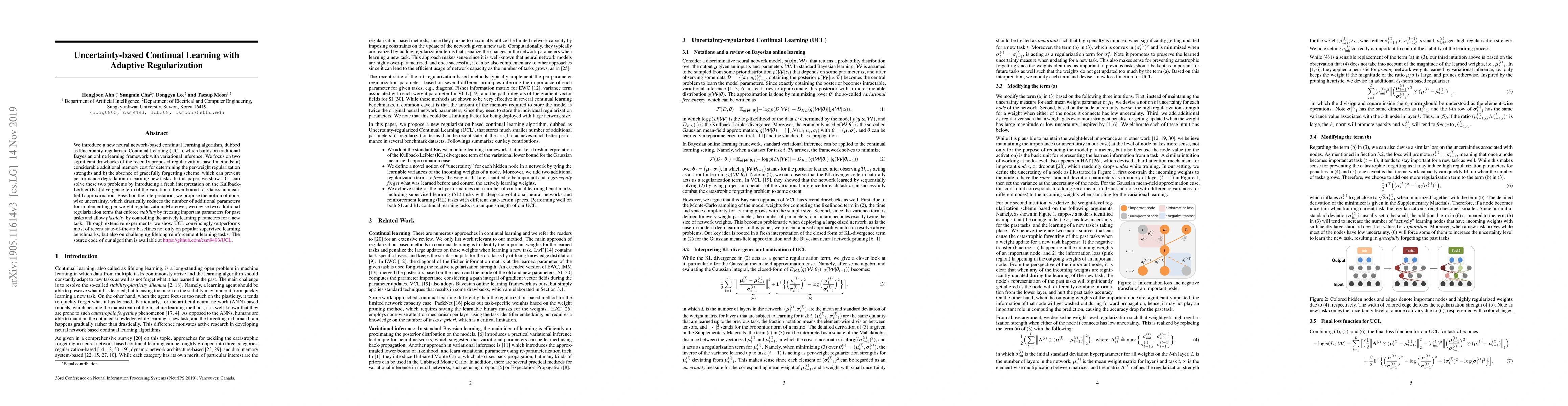 This paper proposes Uncertainty-regularized Continual Learning (UCL), a novel neural network-based continual learning algorithm that addresses memory costs and gracefully forgetting issues in regularization-based methods. UCL introduces node-wise uncertainty and adaptive regularization to outperform state-of-the-art baselines on both supervised and reinforcement learning tasks.