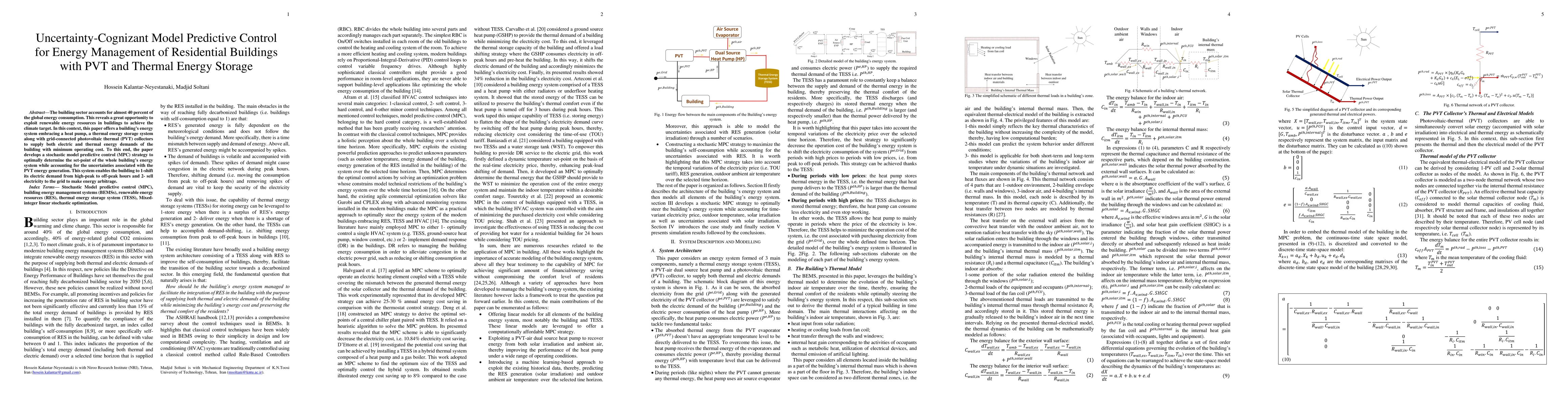 This paper proposes an uncertainty-cognizant model predictive control strategy for managing energy in residential buildings using a combination of PVT collectors, thermal energy storage, and a heat pump to minimize operating costs. The developed stochastic MPC optimally determines the set-point of the energy system while accounting for PVT energy generation uncertainties, enabling demand shifting and energy arbitrage.