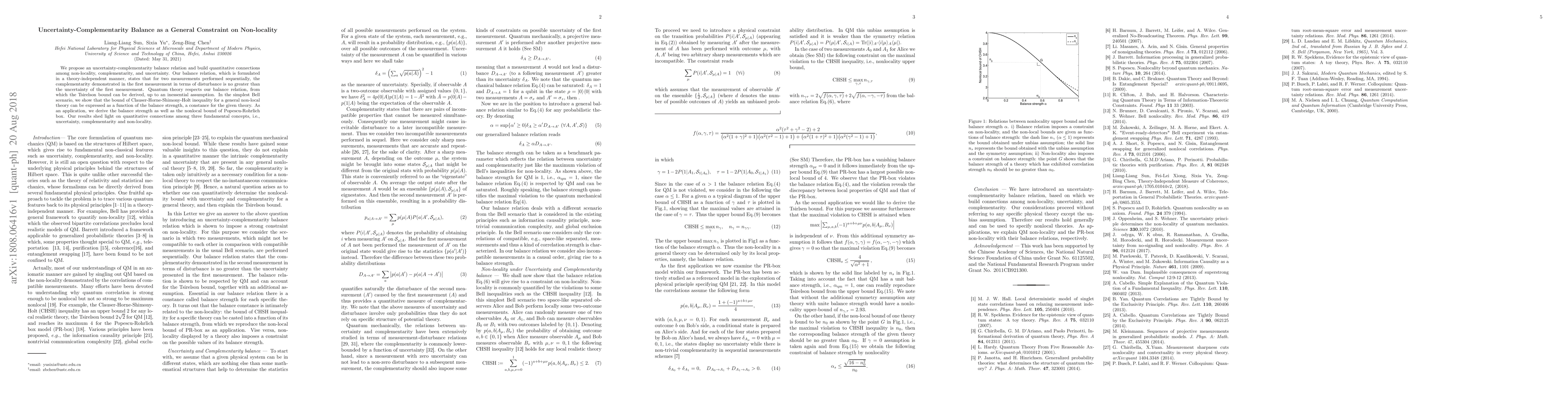 This paper proposes a balance relation between uncertainty and complementarity, showing that the disturbance from the first measurement cannot exceed the uncertainty of that measurement. It demonstrates that quantum theory adheres to this relation, leading to derivations of the Tsirelson bound and the Clauser-Horne-Shimony-Holt inequality, thus illuminating the quantitative links among uncertainty, complementarity, and non-locality.