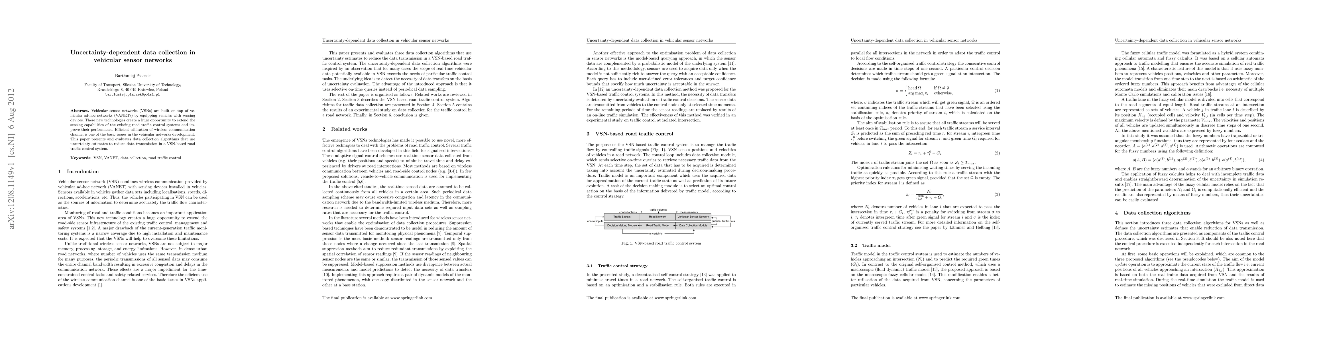The paper presents uncertainty-dependent data collection algorithms for vehicular sensor networks, which adapt traffic control to local flow conditions using a self-organized traffic control strategy.