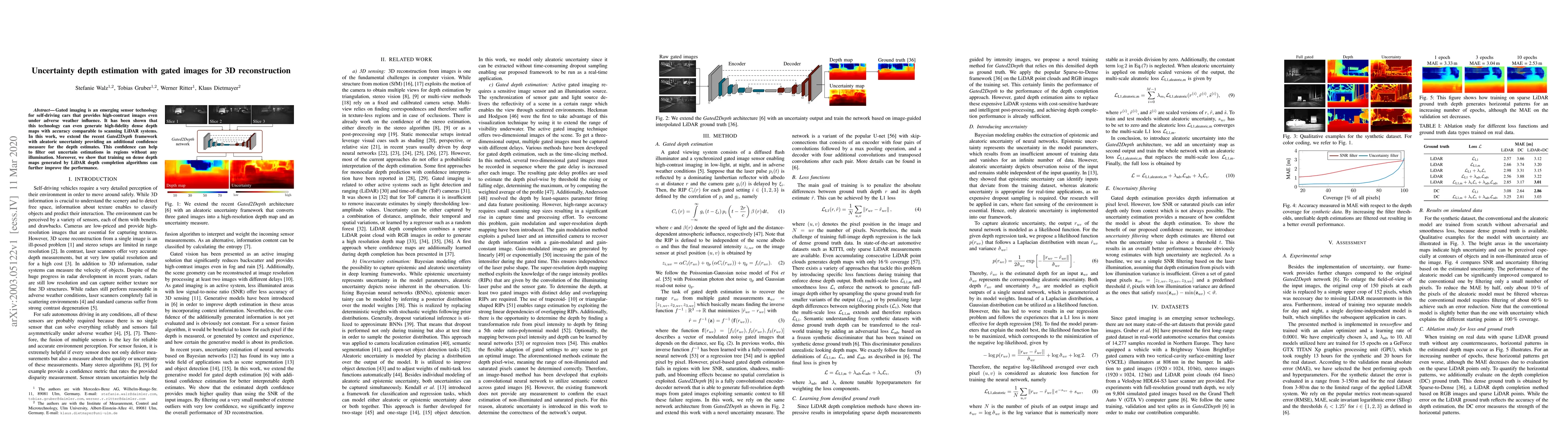 Gated imaging is an emerging sensor technology for self-driving cars that provides high-contrast images even under adverse weather influence. It has been shown that this technology can even generate high-fidelity dense depth maps with accuracy comparable to scanning LiDAR systems. In this work, we extend the recent Gated2Depth framework with aleatoric uncertainty providing an additional confidence measure for the depth estimates. This confidence can help to filter out uncertain estimations in regions without any illumination. Moreover, we show that training on dense depth maps generated by LiDAR depth completion algorithms can further improve the performance.