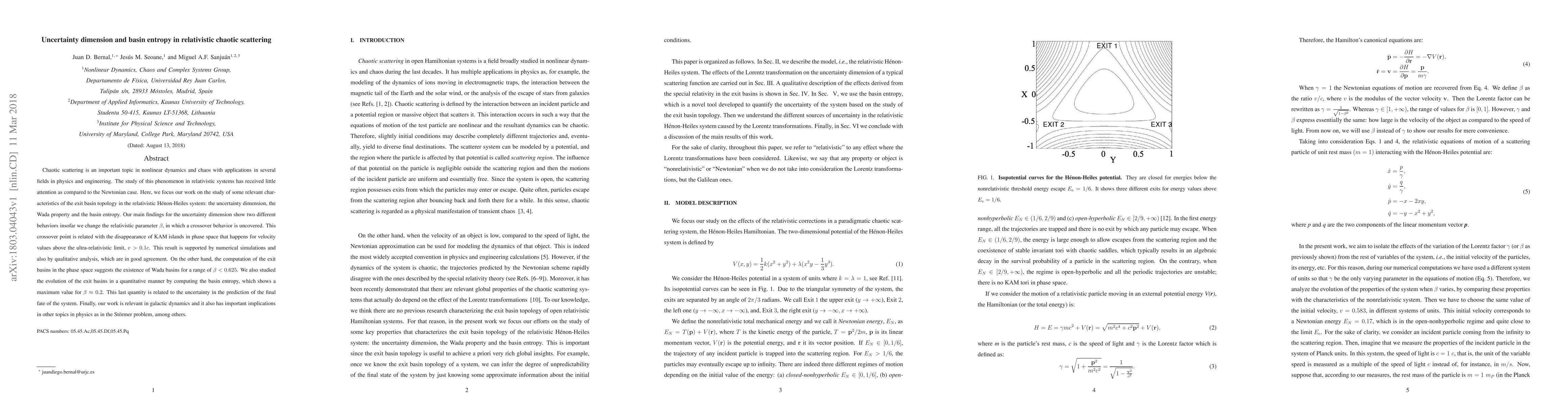 This paper investigates the characteristics of chaotic scattering in relativistic systems, specifically focusing on the relativistic Hénon-Heiles system. It reveals a crossover behavior in the uncertainty dimension linked to the disappearance of KAM islands above ultra-relativistic velocities, and shows the existence of Wada basins for certain parameter values. The study also finds a maximum basin entropy at a specific relativistic parameter, indicating the highest uncertainty in predicting the system's final state.