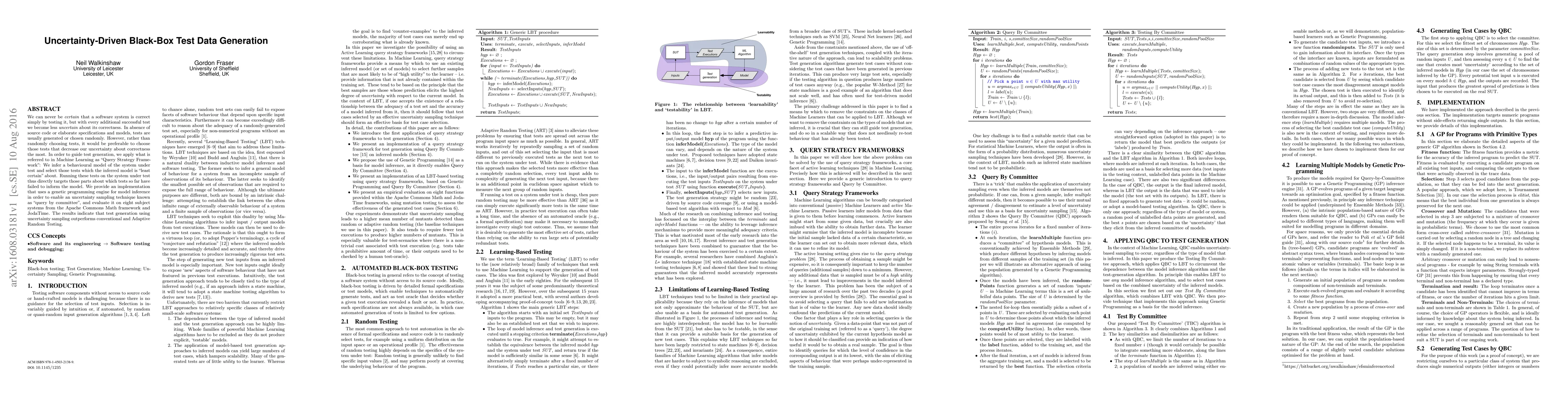 We can never be certain that a software system is correct simply by testing it, but with every additional successful test we become less uncertain about its correctness. In absence of source code or elaborate specifications and models, tests are usually generated or chosen randomly. However, rather than randomly choosing tests, it would be preferable to choose those tests that decrease our uncertainty about correctness the most. In order to guide test generation, we apply what is referred to in Machine Learning as "Query Strategy Framework": We infer a behavioural model of the system under test and select those tests which the inferred model is "least certain" about. Running these tests on the system under test thus directly targets those parts about which tests so far have failed to inform the model. We provide an implementation that uses a genetic programming engine for model inference in order to enable an uncertainty sampling technique known as "query by committee", and evaluate it on eight subject systems from the Apache Commons Math framework and JodaTime. The results indicate that test generation using uncertainty sampling outperforms conventional and Adaptive Random Testing.