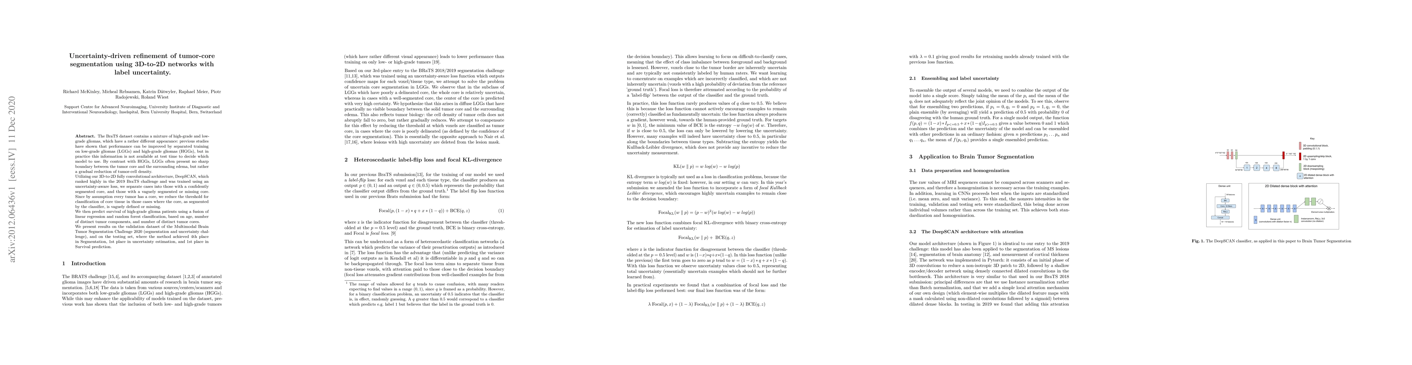 The BraTS dataset contains a mixture of high-grade and low-grade gliomas, which have a rather different appearance: previous studies have shown that performance can be improved by separated training on low-grade gliomas (LGGs) and high-grade gliomas (HGGs), but in practice this information is not available at test time to decide which model to use. By contrast with HGGs, LGGs often present no sharp boundary between the tumor core and the surrounding edema, but rather a gradual reduction of tumor-cell density. Utilizing our 3D-to-2D fully convolutional architecture, DeepSCAN, which ranked highly in the 2019 BraTS challenge and was trained using an uncertainty-aware loss, we separate cases into those with a confidently segmented core, and those with a vaguely segmented or missing core. Since by assumption every tumor has a core, we reduce the threshold for classification of core tissue in those cases where the core, as segmented by the classifier, is vaguely defined or missing. We then predict survival of high-grade glioma patients using a fusion of linear regression and random forest classification, based on age, number of distinct tumor components, and number of distinct tumor cores. We present results on the validation dataset of the Multimodal Brain Tumor Segmentation Challenge 2020 (segmentation and uncertainty challenge), and on the testing set, where the method achieved 4th place in Segmentation, 1st place in uncertainty estimation, and 1st place in Survival prediction.