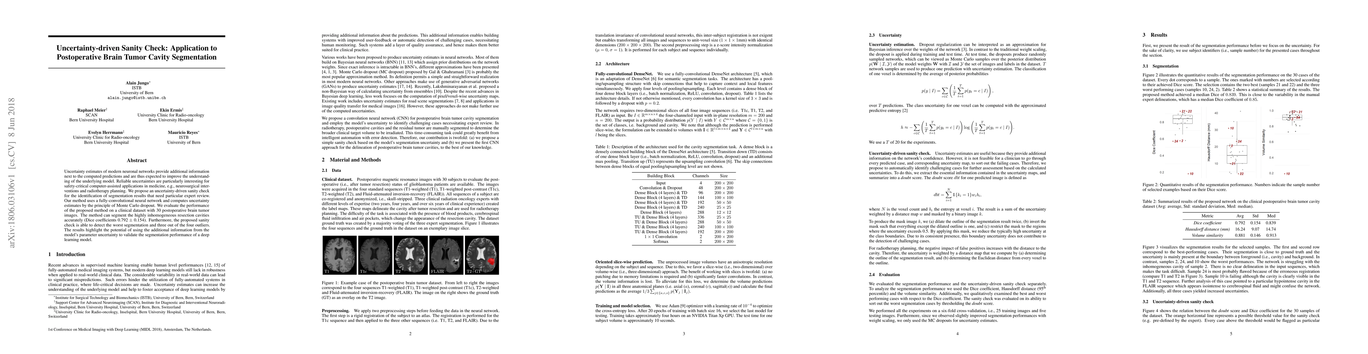Uncertainty estimates of modern neuronal networks provide additional information next to the computed predictions and are thus expected to improve the understanding of the underlying model. Reliable uncertainties are particularly interesting for safety-critical computer-assisted applications in medicine, e.g., neurosurgical interventions and radiotherapy planning. We propose an uncertainty-driven sanity check for the identification of segmentation results that need particular expert review. Our method uses a fully-convolutional neural network and computes uncertainty estimates by the principle of Monte Carlo dropout. We evaluate the performance of the proposed method on a clinical dataset with 30 postoperative brain tumor images. The method can segment the highly inhomogeneous resection cavities accurately (Dice coefficients 0.792 $\pm$ 0.154). Furthermore, the proposed sanity check is able to detect the worst segmentation and three out of the four outliers. The results highlight the potential of using the additional information from the model's parameter uncertainty to validate the segmentation performance of a deep learning model.