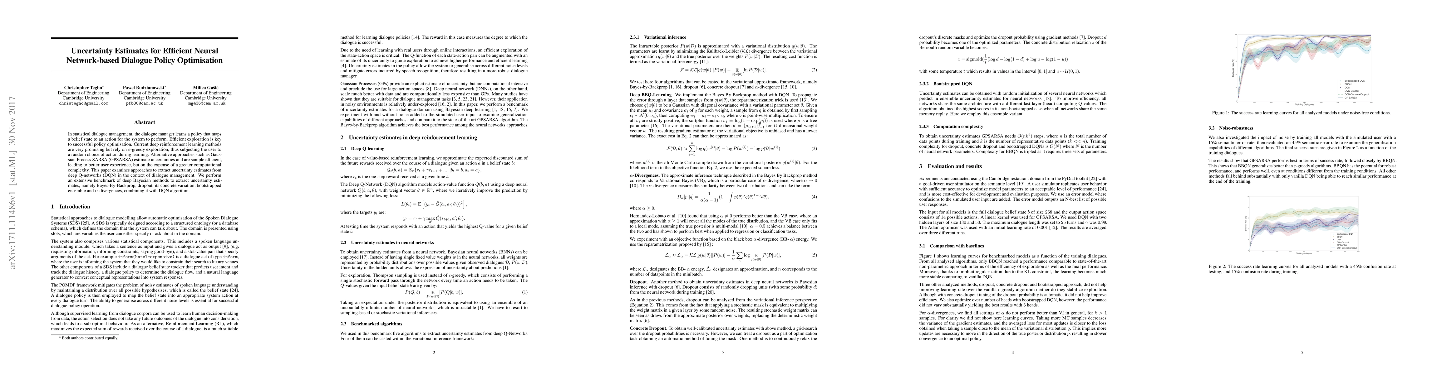 In statistical dialogue management, the dialogue manager learns a policy that maps a belief state to an action for the system to perform. Efficient exploration is key to successful policy optimisation. Current deep reinforcement learning methods are very promising but rely on epsilon-greedy exploration, thus subjecting the user to a random choice of action during learning. Alternative approaches such as Gaussian Process SARSA (GPSARSA) estimate uncertainties and are sample efficient, leading to better user experience, but on the expense of a greater computational complexity. This paper examines approaches to extract uncertainty estimates from deep Q-networks (DQN) in the context of dialogue management. We perform an extensive benchmark of deep Bayesian methods to extract uncertainty estimates, namely Bayes-By-Backprop, dropout, its concrete variation, bootstrapped ensemble and alpha-divergences, combining it with DQN algorithm.