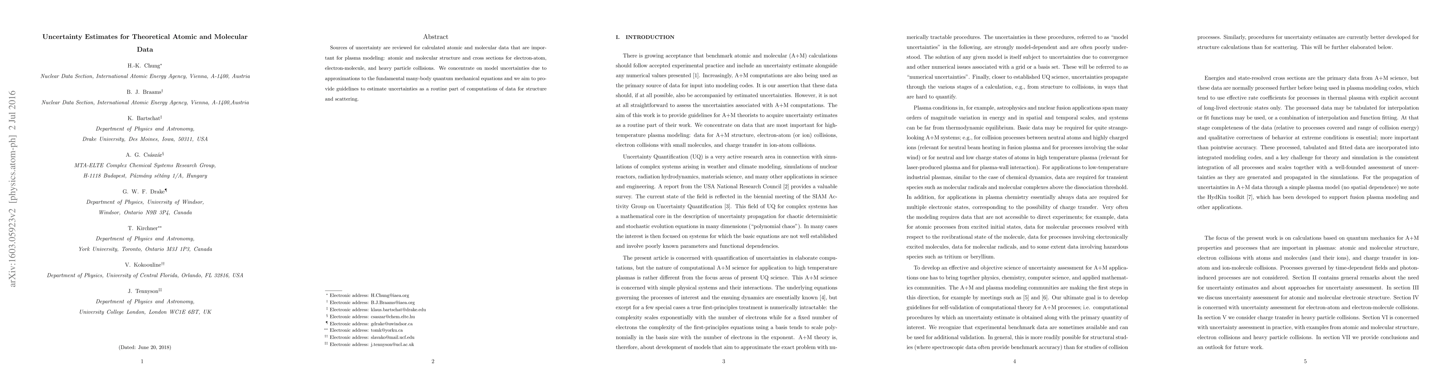 This paper reviews sources of uncertainty in theoretical atomic and molecular data crucial for plasma modeling, focusing on approximations in quantum mechanical equations. It aims to offer guidelines for estimating uncertainties in calculations of atomic structure and scattering cross sections.