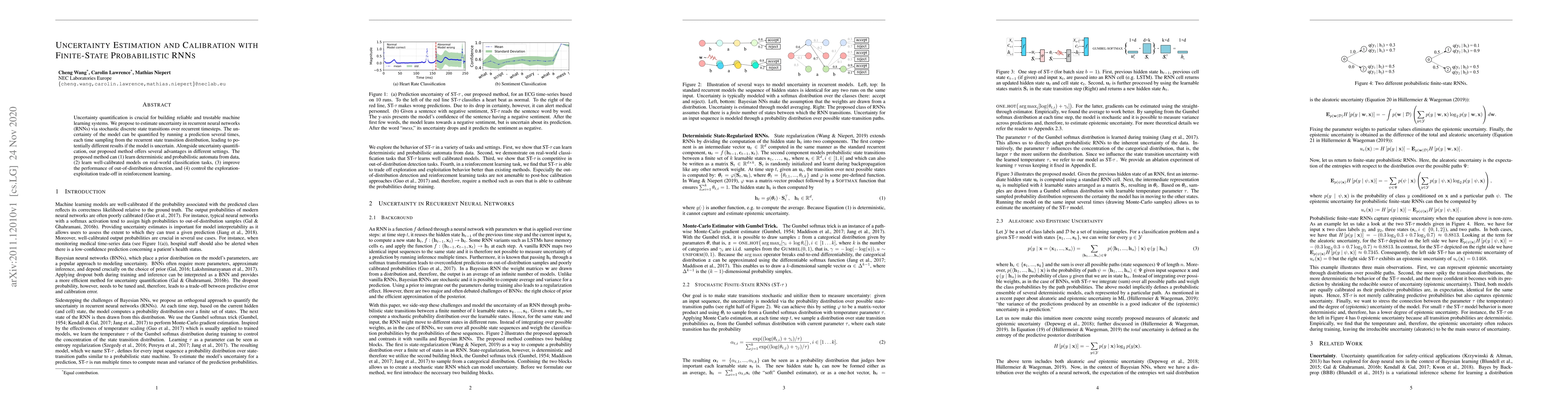 Uncertainty quantification is crucial for building reliable and trustable machine learning systems. We propose to estimate uncertainty in recurrent neural networks (RNNs) via stochastic discrete state transitions over recurrent timesteps. The uncertainty of the model can be quantified by running a prediction several times, each time sampling from the recurrent state transition distribution, leading to potentially different results if the model is uncertain. Alongside uncertainty quantification, our proposed method offers several advantages in different settings. The proposed method can (1) learn deterministic and probabilistic automata from data, (2) learn well-calibrated models on real-world classification tasks, (3) improve the performance of out-of-distribution detection, and (4) control the exploration-exploitation trade-off in reinforcement learning.