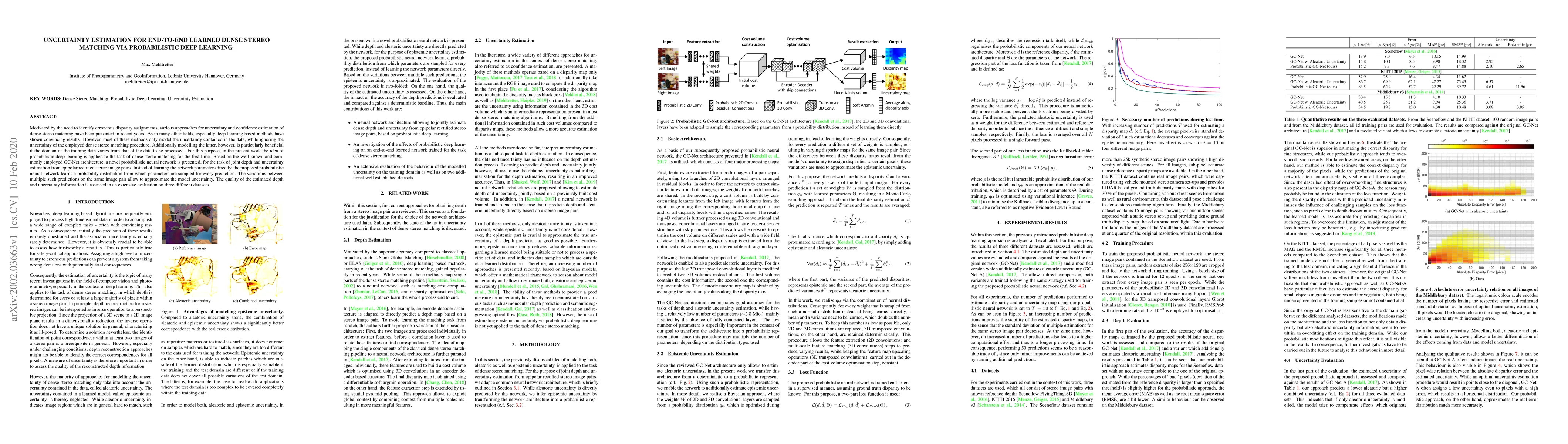 This paper introduces a probabilistic deep learning approach for end-to-end dense stereo matching, specifically applying it to the GC-Net architecture. It aims to estimate both depth and uncertainty by sampling network parameters from a learned probability distribution, thereby capturing model uncertainty and improving performance when training and test data domains differ.