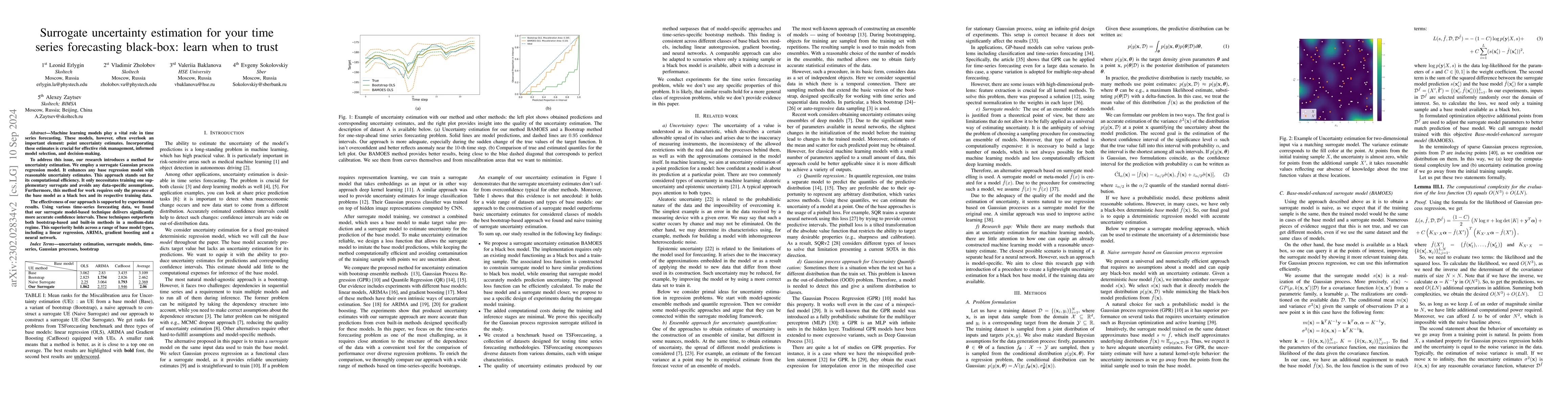 This study introduces a Gaussian process regression surrogate method for estimating uncertainty in time series forecasting models, enabling robust predictions with accurate confidence intervals. Experiments demonstrate that this approach outperforms bootstrap-based methods, especially in medium and small-data scenarios, across various base models.