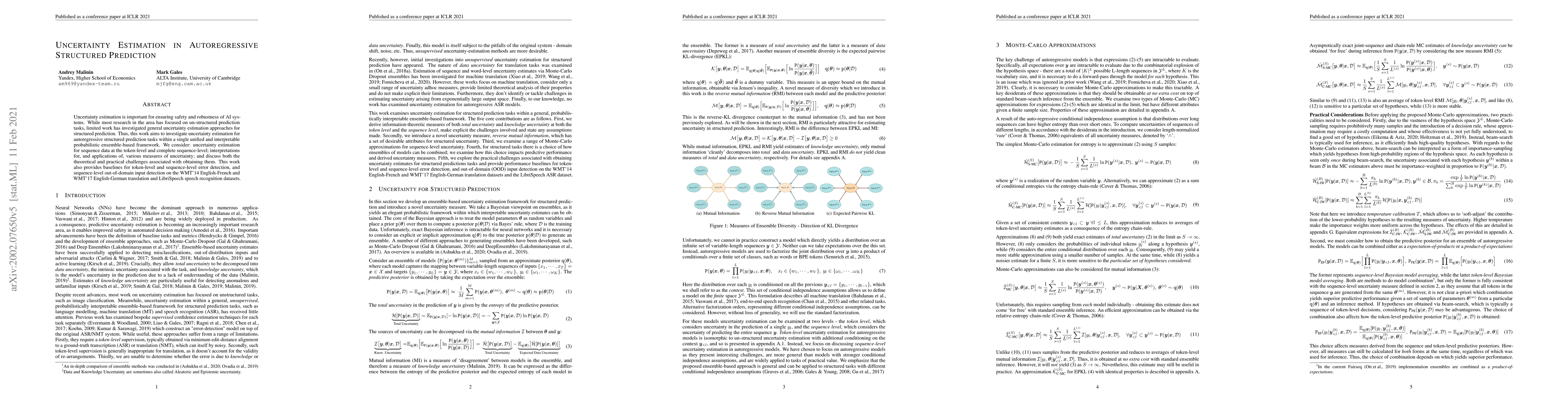 Uncertainty estimation is important for ensuring safety and robustness of AI systems. While most research in the area has focused on un-structured prediction tasks, limited work has investigated general uncertainty estimation approaches for structured prediction. Thus, this work aims to investigate uncertainty estimation for autoregressive structured prediction tasks within a single unified and interpretable probabilistic ensemble-based framework. We consider: uncertainty estimation for sequence data at the token-level and complete sequence-level; interpretations for, and applications of, various measures of uncertainty; and discuss both the theoretical and practical challenges associated with obtaining them. This work also provides baselines for token-level and sequence-level error detection, and sequence-level out-of-domain input detection on the WMT'14 English-French and WMT'17 English-German translation and LibriSpeech speech recognition datasets.