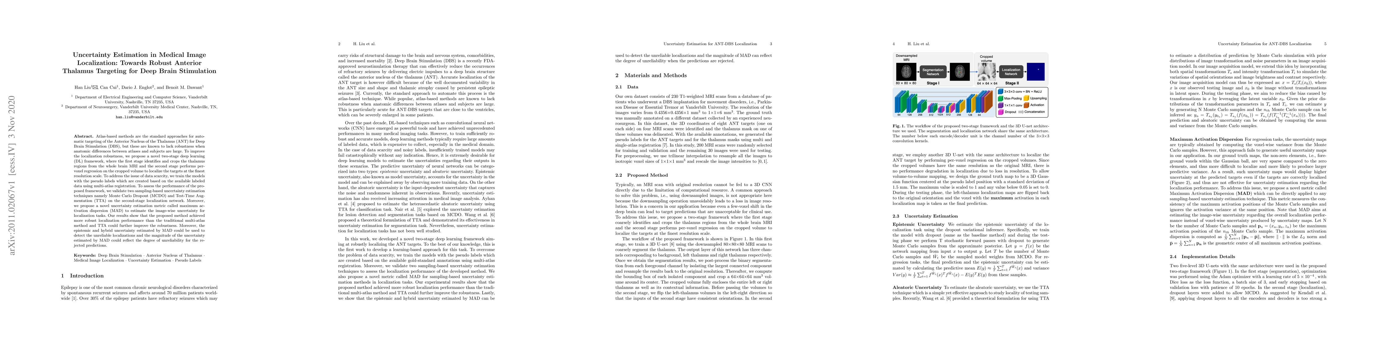 This paper proposes a two-stage deep learning framework to enhance the robustness of Anterior Nucleus of the Thalamus localization for Deep Brain Stimulation, addressing data scarcity with pseudo labels. It introduces uncertainty estimation techniques like Monte Carlo Dropout and Test-Time Augmentation, along with a novel metric, maximum activation dispersion, to assess localization reliability.