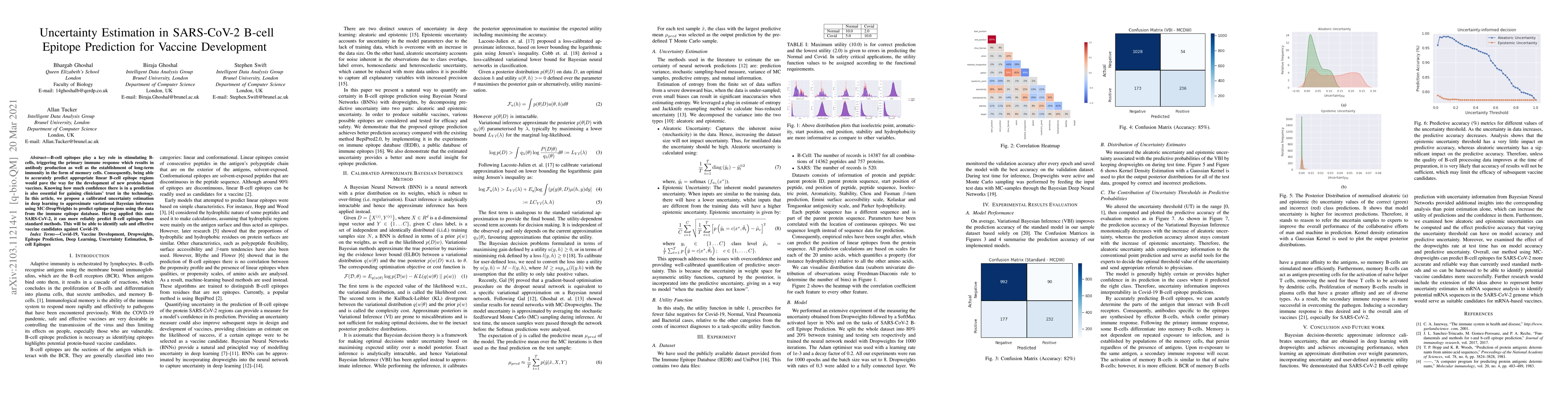 B-cell epitopes play a key role in stimulating B-cells, triggering the primary immune response which results in antibody production as well as the establishment of long-term immunity in the form of memory cells. Consequently, being able to accurately predict appropriate linear B-cell epitope regions would pave the way for the development of new protein-based vaccines. Knowing how much confidence there is in a prediction is also essential for gaining clinicians' trust in the technology. In this article, we propose a calibrated uncertainty estimation in deep learning to approximate variational Bayesian inference using MC-DropWeights to predict epitope regions using the data from the immune epitope database. Having applied this onto SARS-CoV-2, it can more reliably predict B-cell epitopes than standard methods. This will be able to identify safe and effective vaccine candidates against Covid-19.