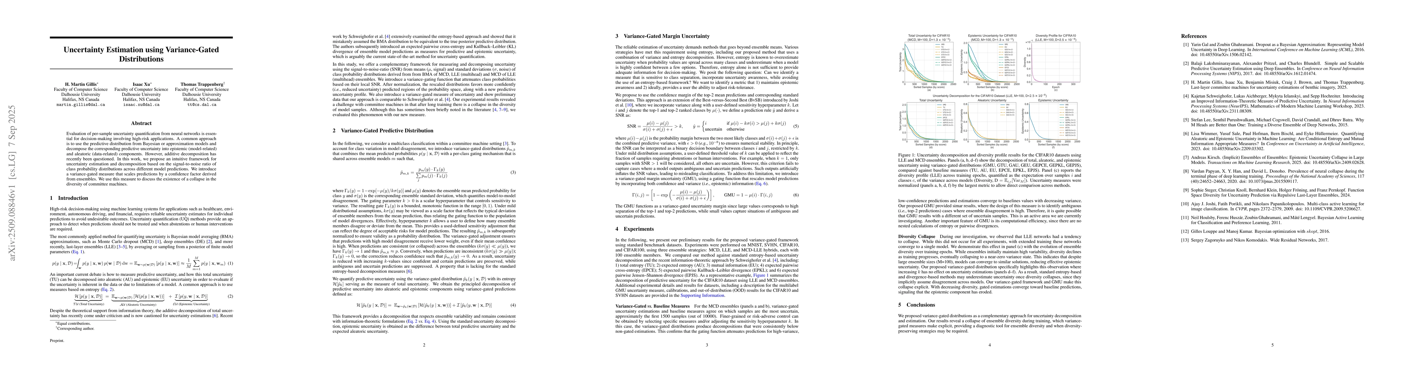 Evaluation of per-sample uncertainty quantification from neural networks is essential for decision-making involving high-risk applications. A common approach is to use the predictive distribution from Bayesian or approximation models and decompose the corresponding predictive uncertainty into epistemic (model-related) and aleatoric (data-related) components. However, additive decomposition has recently been questioned. In this work, we propose an intuitive framework for uncertainty estimation and decomposition based on the signal-to-noise ratio of class probability distributions across different model predictions. We introduce a variance-gated measure that scales predictions by a confidence factor derived from ensembles. We use this measure to discuss the existence of a collapse in the diversity of committee machines.