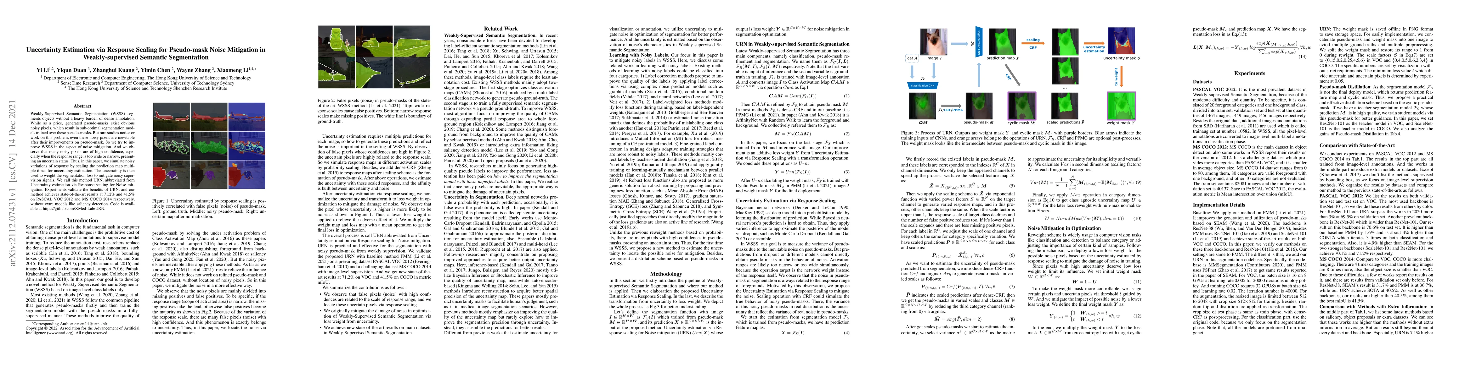 This paper proposes URN, a method for uncertainty estimation via response scaling to mitigate noise in pseudo-masks for weakly-supervised semantic segmentation. The method scales prediction maps to estimate uncertainty, which is then used to weight the segmentation loss, achieving state-of-the-art results on PASCAL VOC 2012 and MS COCO 2014 datasets.