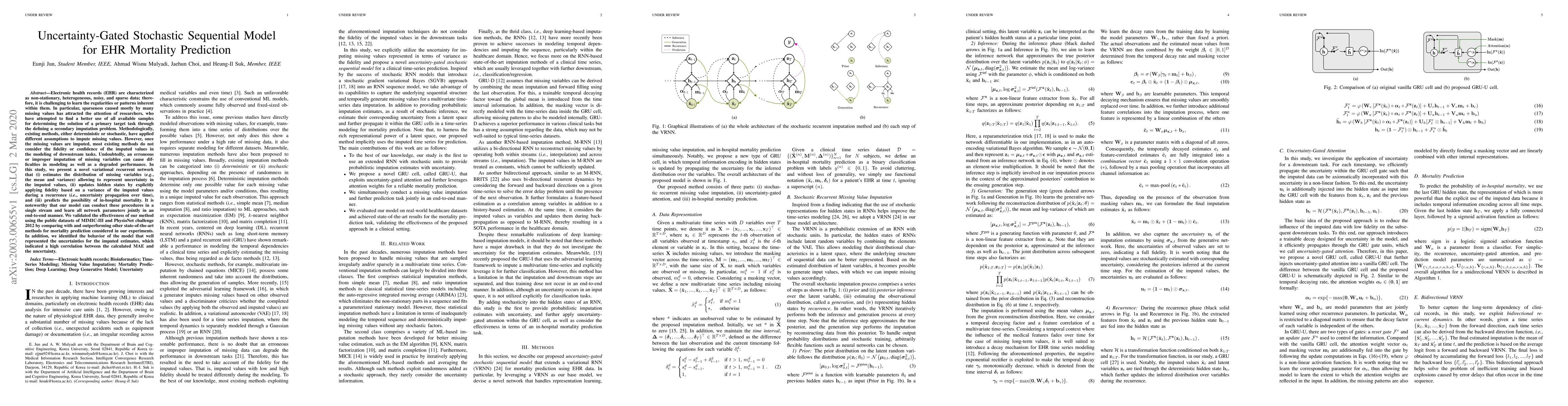 Electronic health records (EHR) are characterized as non-stationary, heterogeneous, noisy, and sparse data; therefore, it is challenging to learn the regularities or patterns inherent within them. In particular, sparseness caused mostly by many missing values has attracted the attention of researchers, who have attempted to find a better use of all available samples for determining the solution of a primary target task through the defining a secondary imputation problem. Methodologically, existing methods, either deterministic or stochastic, have applied different assumptions to impute missing values. However, once the missing values are imputed, most existing methods do not consider the fidelity or confidence of the imputed values in the modeling of downstream tasks. Undoubtedly, an erroneous or improper imputation of missing variables can cause difficulties in modeling as well as a degraded performance. In this study, we present a novel variational recurrent network that (i) estimates the distribution of missing variables allowing to represent uncertainty in the imputed values, (ii) updates hidden states by explicitly applying fidelity based on a variance of the imputed values during a recurrence (i.e., uncertainty propagation over time), and (iii) predicts the possibility of in-hospital mortality. It is noteworthy that our model can conduct these procedures in a single stream and learn all network parameters jointly in an end-to-end manner. We validated the effectiveness of our method using the public datasets of MIMIC-III and PhysioNet challenge 2012 by comparing with and outperforming other state-of-the-art methods for mortality prediction considered in our experiments. In addition, we identified the behavior of the model that well represented the uncertainties for the imputed estimates, which indicated a high correlation between the calculated MAE and the uncertainty.