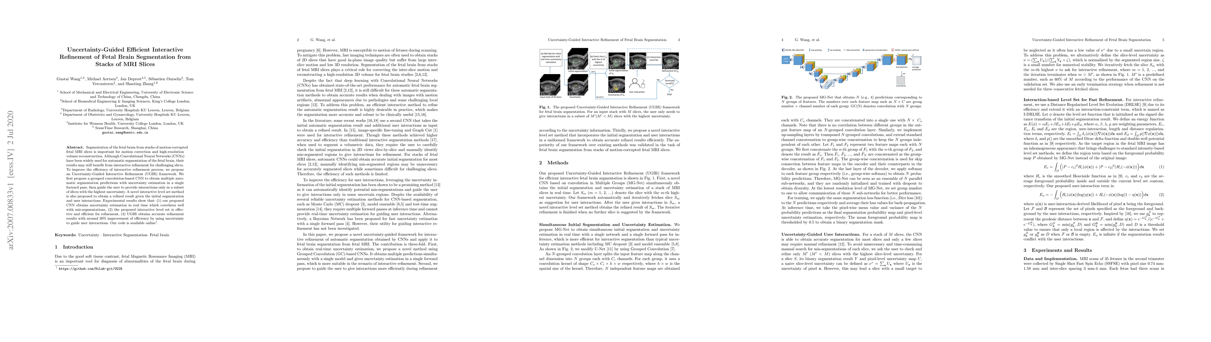 This paper proposes an Uncertainty-Guided Interactive Refinement (UGIR) framework to enhance fetal brain segmentation from motion-corrupted MRI slices. The UGIR framework uses a grouped convolution-based CNN for real-time uncertainty estimation and guides users to refine only the most uncertain slices, significantly improving efficiency by around 30%.