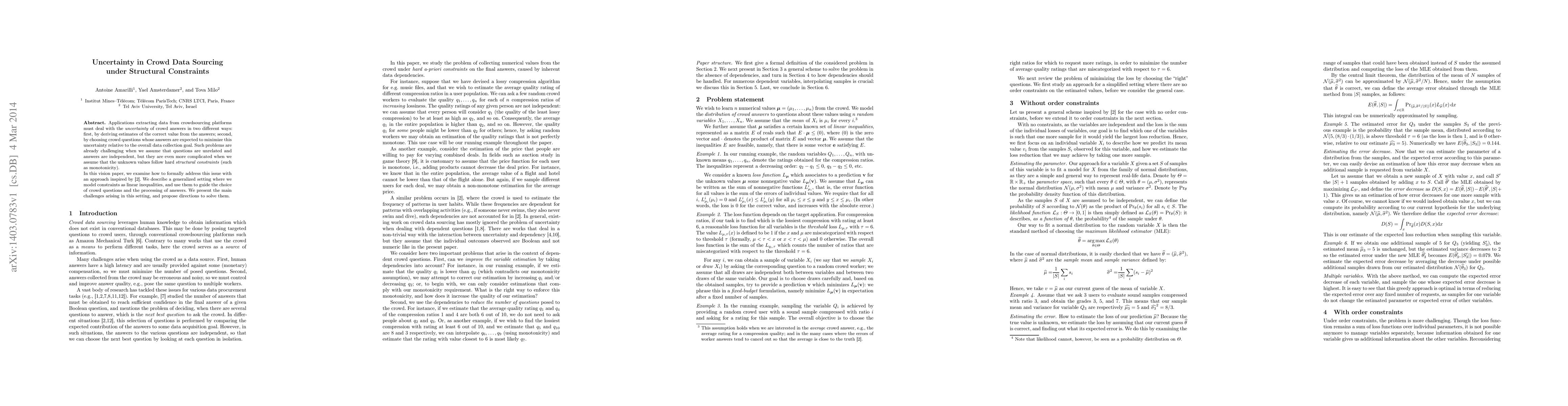 This work is novel in its approach to explicitly address uncertainty in crowd data sourcing under structural constraints, providing a method to model these constraints as linear inequalities and guide question selection and answer processing.