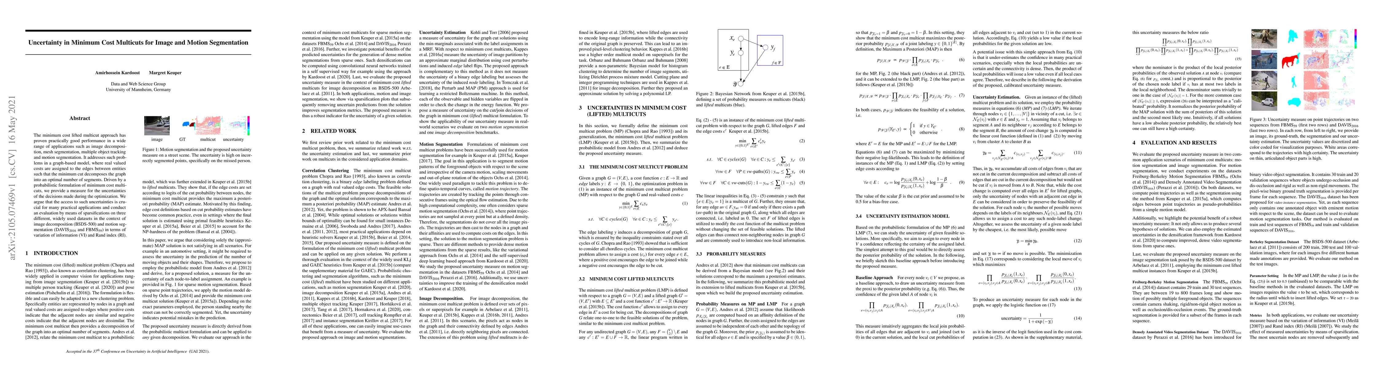 This paper introduces a probabilistic measure for uncertainties in minimum cost multicut optimization for image and motion segmentation, demonstrating its importance through evaluations on BSDS-500, DAVIS2016, and FBMS59 datasets using variation of information and Rand index metrics.