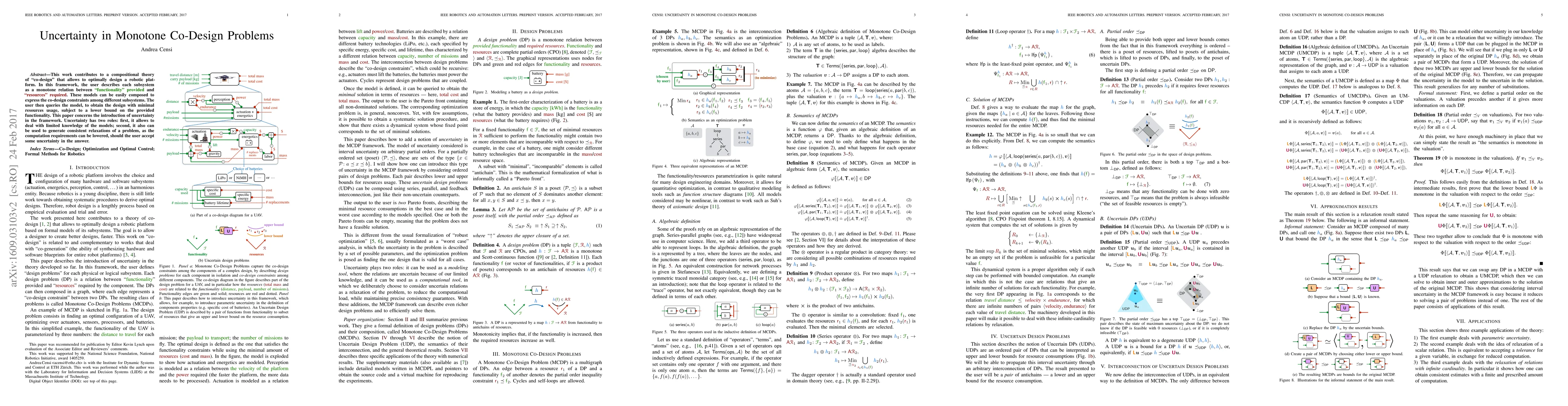 This work contributes to a compositional theory of "co-design" that allows to optimally design a robotic platform. In this framework, the user describes each subsystem as a monotone relation between "functionality" provided and "resources" required. These models can be easily composed to express the co-design constraints among different subsystems. The user then queries the model, to obtain the design with minimal resources usage, subject to a lower bound on the provided functionality. This paper concerns the introduction of uncertainty in the framework. Uncertainty has two roles: first, it allows to deal with limited knowledge of the models; second, it also can be used to generate consistent relaxations of a problem, as the computation requirements can be lowered, should the user accept some uncertainty in the answer.