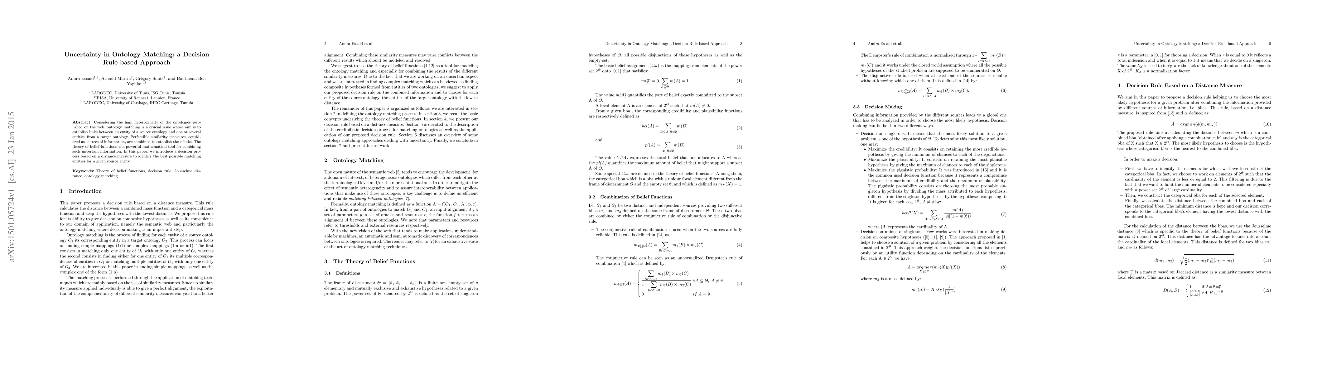 This paper proposes a decision rule-based approach for ontology matching that leverages the theory of belief functions to combine imperfect similarity measures. It introduces a distance measure to identify the best matching entities between source and target ontologies, addressing the high heterogeneity of web-published ontologies.