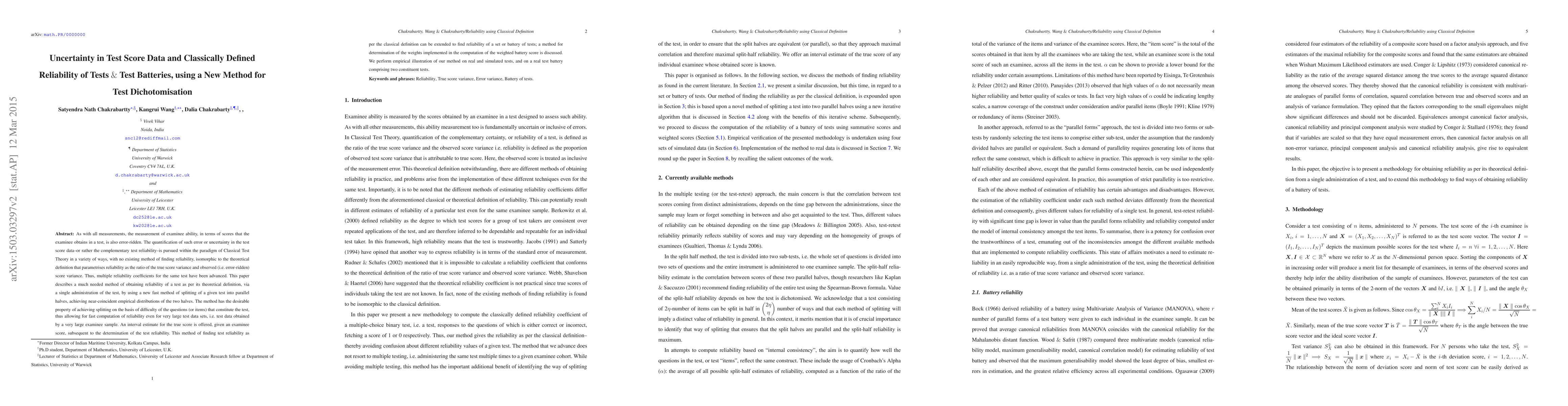 As with all measurements, the measurement of examinee ability, in terms of scores that the examinee obtains in a test, is also error-ridden. The quantification of such error or uncertainty in the test score data--or rather the complementary test reliability--is pursued within the paradigm of Classical Test Theory in a variety of ways, with no existing method of finding reliability, isomorphic to the theoretical definition that parametrises reliability as the ratio of the true score variance and observed (i.e. error-ridden) score variance. Thus, multiple reliability coefficients for the same test have been advanced. This paper describes a much needed method of obtaining reliability of a test as per its theoretical definition, via a single administration of the test, by using a new fast method of splitting of a given test into parallel halves, achieving near-coincident empirical distributions of the two halves. The method has the desirable property of achieving splitting on the basis of difficulty of the questions (or items) that constitute the test, thus allowing for fast computation of reliability even for very large test data sets, i.e. test data obtained by a very large examinee sample. An interval estimate for the true score is offered, given an examinee score, subsequent to the determination of the test reliability. This method of finding test reliability as per the classical definition can be extended to find reliability of a set or battery of tests; a method for determination of the weights implemented in the computation of the weighted battery score is discussed. We perform empirical illustration of our method on real and simulated tests, and on a real test battery comprising two constituent tests.