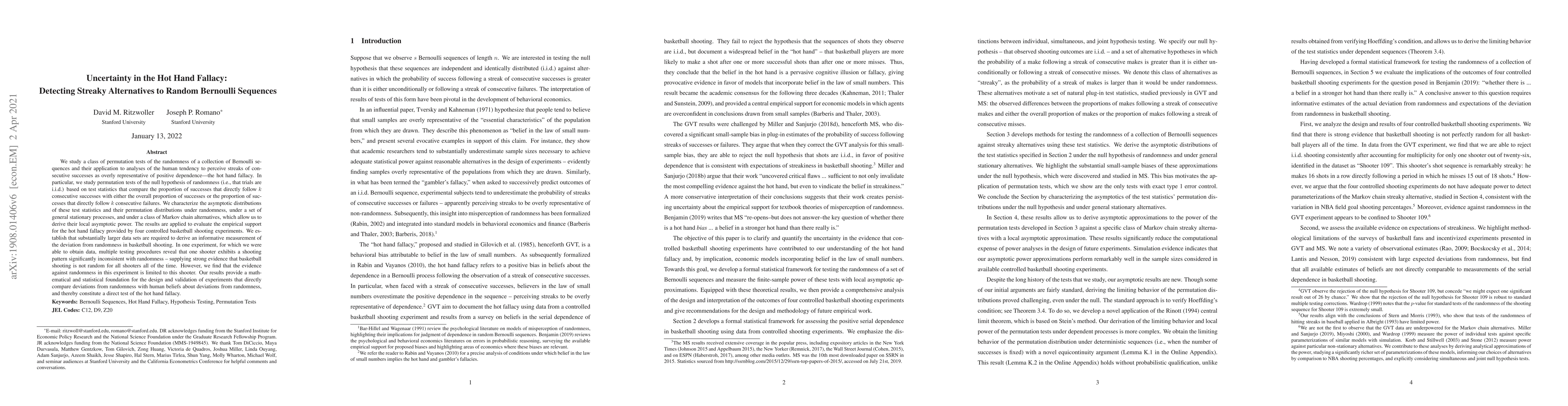 We study a class of permutation tests of the randomness of a collection of Bernoulli sequences and their application to analyses of the human tendency to perceive streaks of consecutive successes as overly representative of positive dependence - the hot hand fallacy. In particular, we study permutation tests of the null hypothesis of randomness (i.e., that trials are i.i.d.) based on test statistics that compare the proportion of successes that directly follow k consecutive successes with either the overall proportion of successes or the proportion of successes that directly follow k consecutive failures. We characterize the asymptotic distributions of these test statistics and their permutation distributions under randomness, under a set of general stationary processes, and under a class of Markov chain alternatives, which allow us to derive their local asymptotic power. The results are applied to evaluate the empirical support for the hot hand fallacy provided by four controlled basketball shooting experiments. We establish that substantially larger data sets are required to derive an informative measurement of the deviation from randomness in basketball shooting. In one experiment, for which we were able to obtain data, multiple testing procedures reveal that one shooter exhibits a shooting pattern significantly inconsistent with randomness - supplying strong evidence that basketball shooting is not random for all shooters all of the time. However, we find that the evidence against randomness in this experiment is limited to this shooter. Our results provide a mathematical and statistical foundation for the design and validation of experiments that directly compare deviations from randomness with human beliefs about deviations from randomness, and thereby constitute a direct test of the hot hand fallacy.