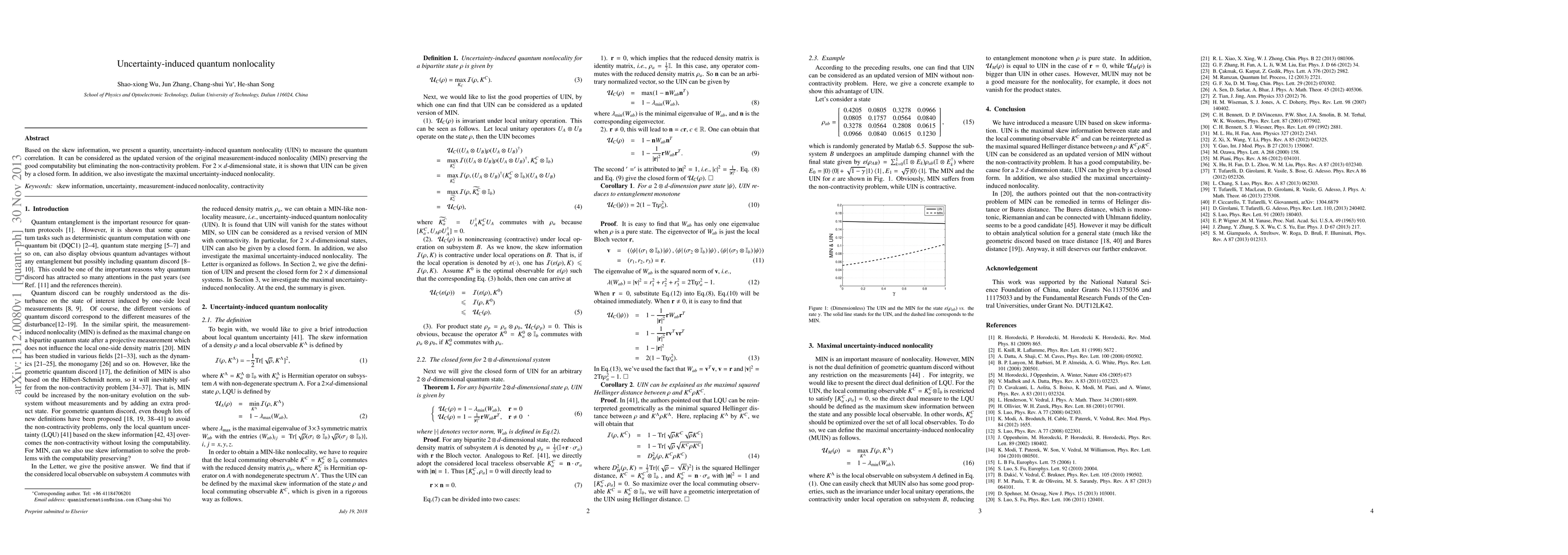 This paper introduces uncertainty-induced quantum nonlocality (UIN) as a measure of quantum correlation based on skew information, offering an improved version of measurement-induced nonlocality (MIN) while maintaining computability and resolving non-contractivity issues. The authors derive a closed form for UIN in 2 x d-dimensional states and explore the maximal UIN.