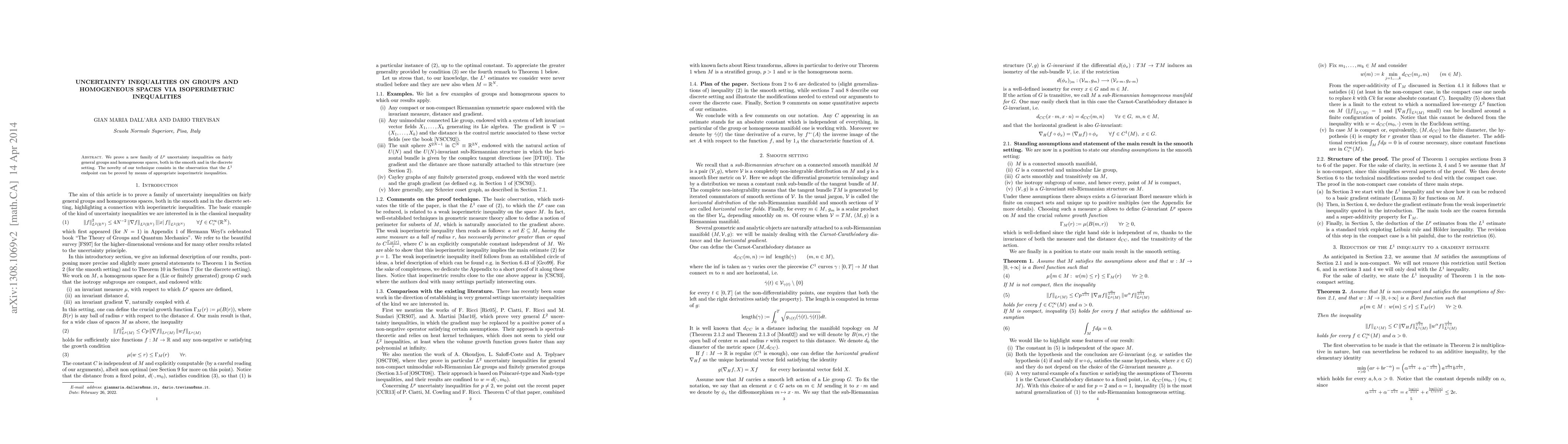 Summary: This paper establishes $L^p$ uncertainty inequalities on groups and homogeneous spaces, emphasizing the $L^1$ endpoint derived from a general weak isoperimetric inequality, applicable in both smooth and discrete settings.
