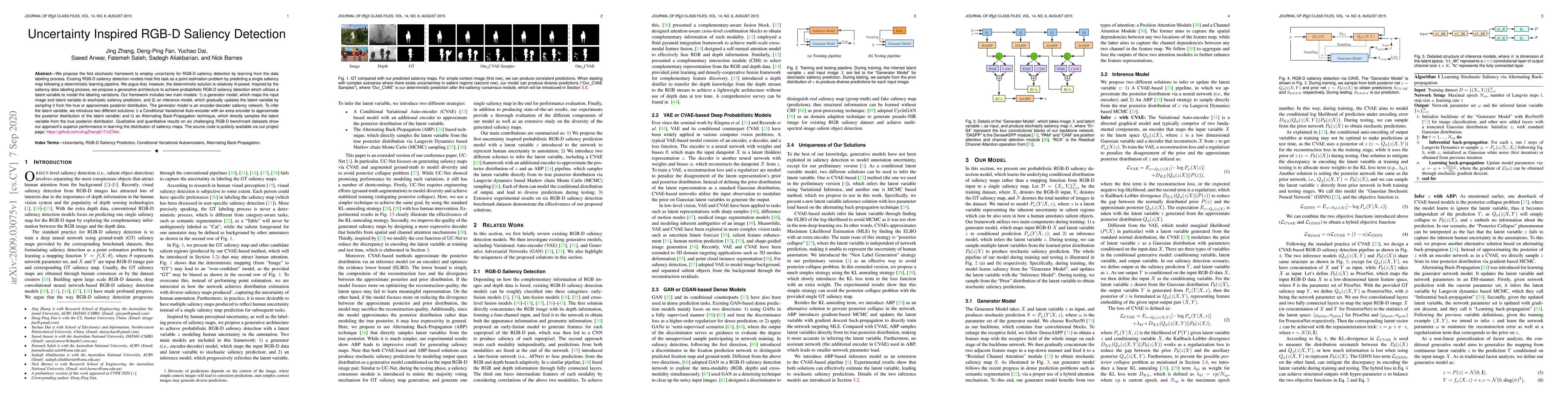 This paper introduces a stochastic framework for RGB-D saliency detection that leverages uncertainty through a generative architecture, contrasting with deterministic models. The proposed method includes a generator model and an inference model to achieve probabilistic saliency predictions, demonstrating superior performance on benchmark datasets.